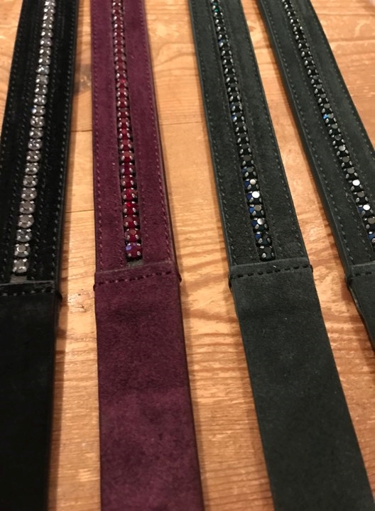 Anna Scarpati Kaspy W19 er et lækkert blødt læderbælte med ruskindsoverflade og en række fine sten som er tone-i-tone med bæltet på det bordeaux og grønne bælte. Det sorte bælte har klare sten. Spændet er sølvfarvet - Anna Scarpati bæltet Kaspy er en del af Anna Scarpatis vinterkollektion 2019, hvorfor der kun findes et begrænset antal af disse bælter. Et flot bælte til dit rideoutfit både til stævne og til hverdag- men sandelig også et bælte som vil klæde et par jeans!