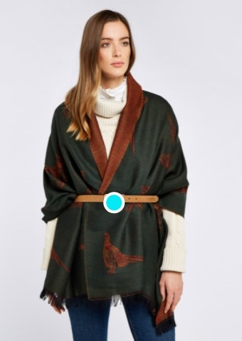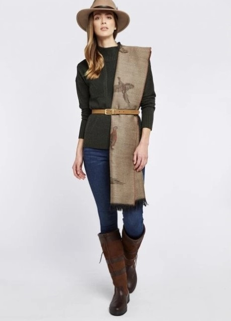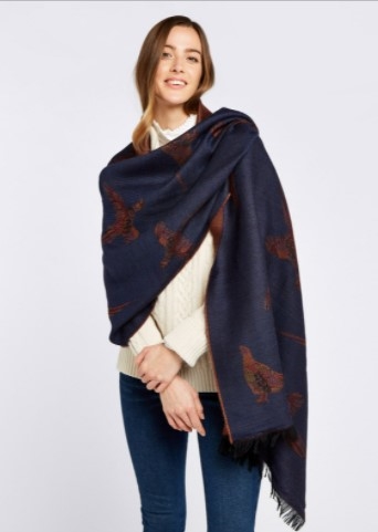 Med Dubarry Birchdale kan du både have det lækkert lunt og være super chic! Det ultimative og super klassiske "countrystyle" tørklæde. Måske bedre betegnet som sjal. Super lækker kvalitet og kan bruges på mange måder. Fremstillet i Skotland af 100% uld med smukt fasanmotiv vævet ind i stoffet. Kontrastfarve på bagsiden. En perfekt gave til veninden, moderen eller hjælperen som elsker jagt, natur og countrystyle. Dubarry Birchdale er meget behageligt i materialet og den 100% jacquard uld med smukt motiv oser af elegance og stil samtidig med at du holder dig varm.