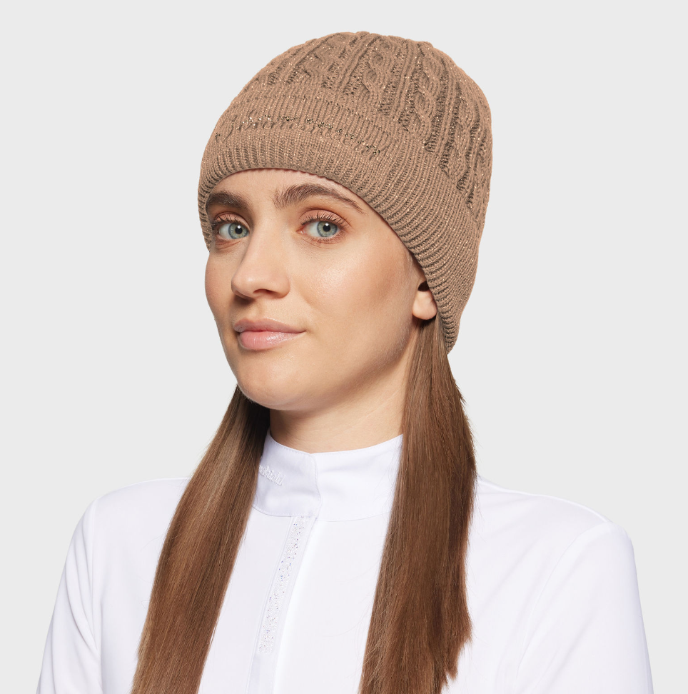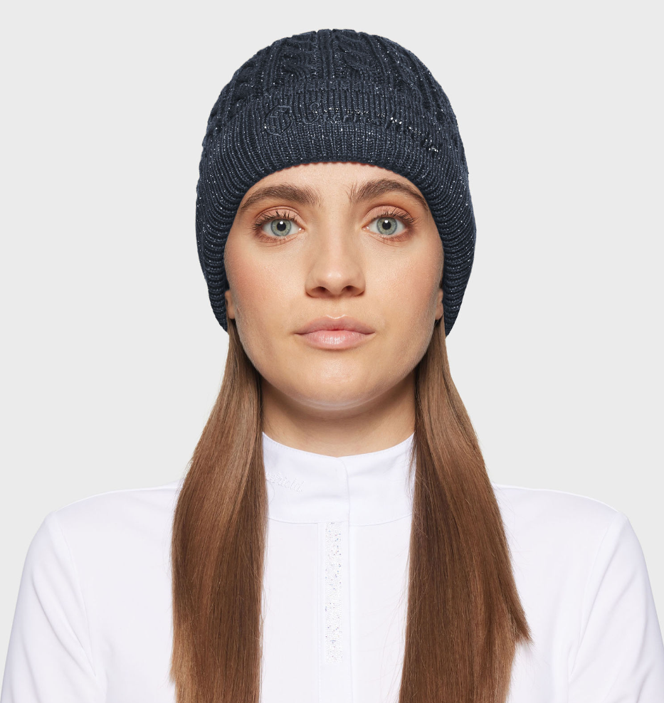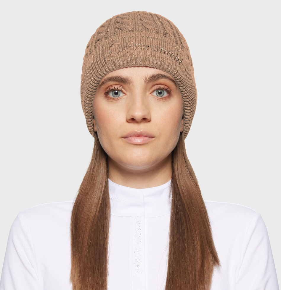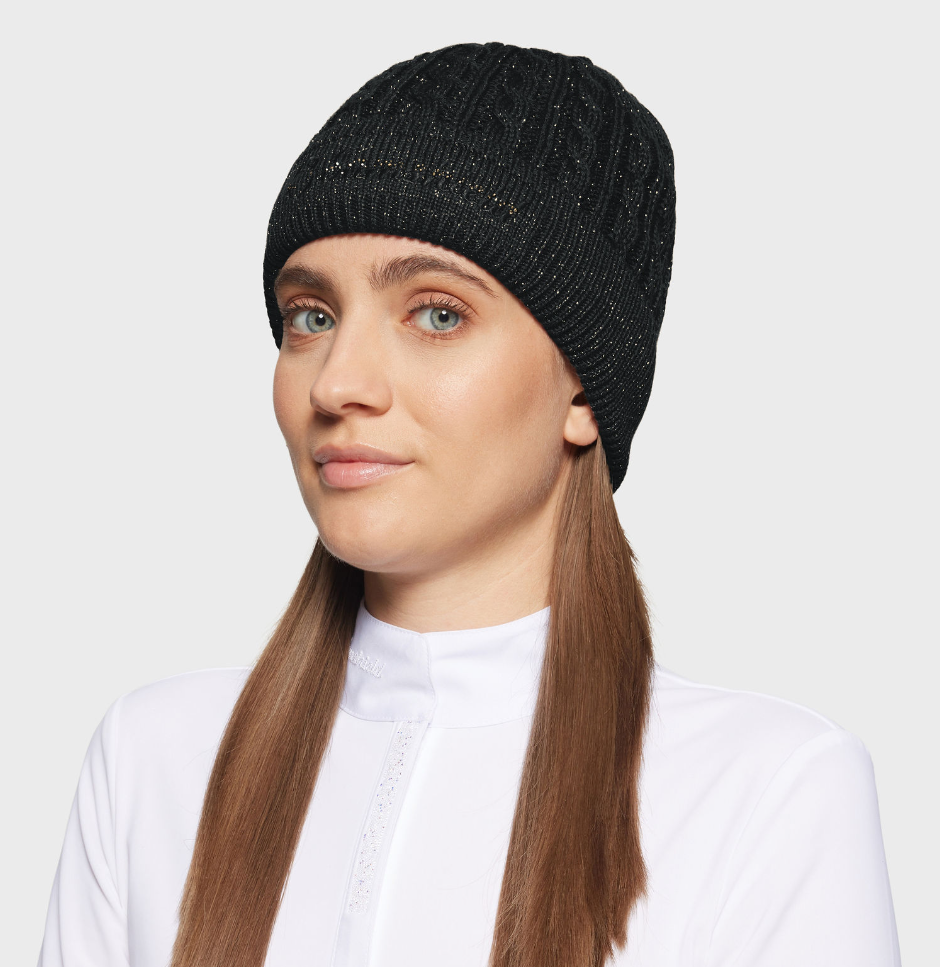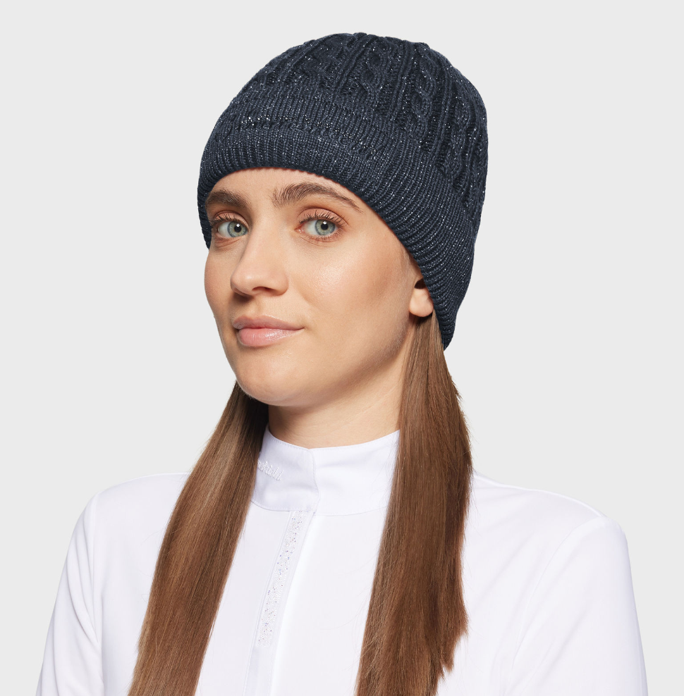 Samshield Beanie Mira crystal - lækker hue med enkelt Samshield logo med broderi og krystaller foran. Garnet her er med lurex og let glimtrende. En uge som er behagelig at have på grundet blød fleece på indersiden- og pæn nok til byturen! Men naturligvis også velegnet til de kolde dage i stald og ridehus.