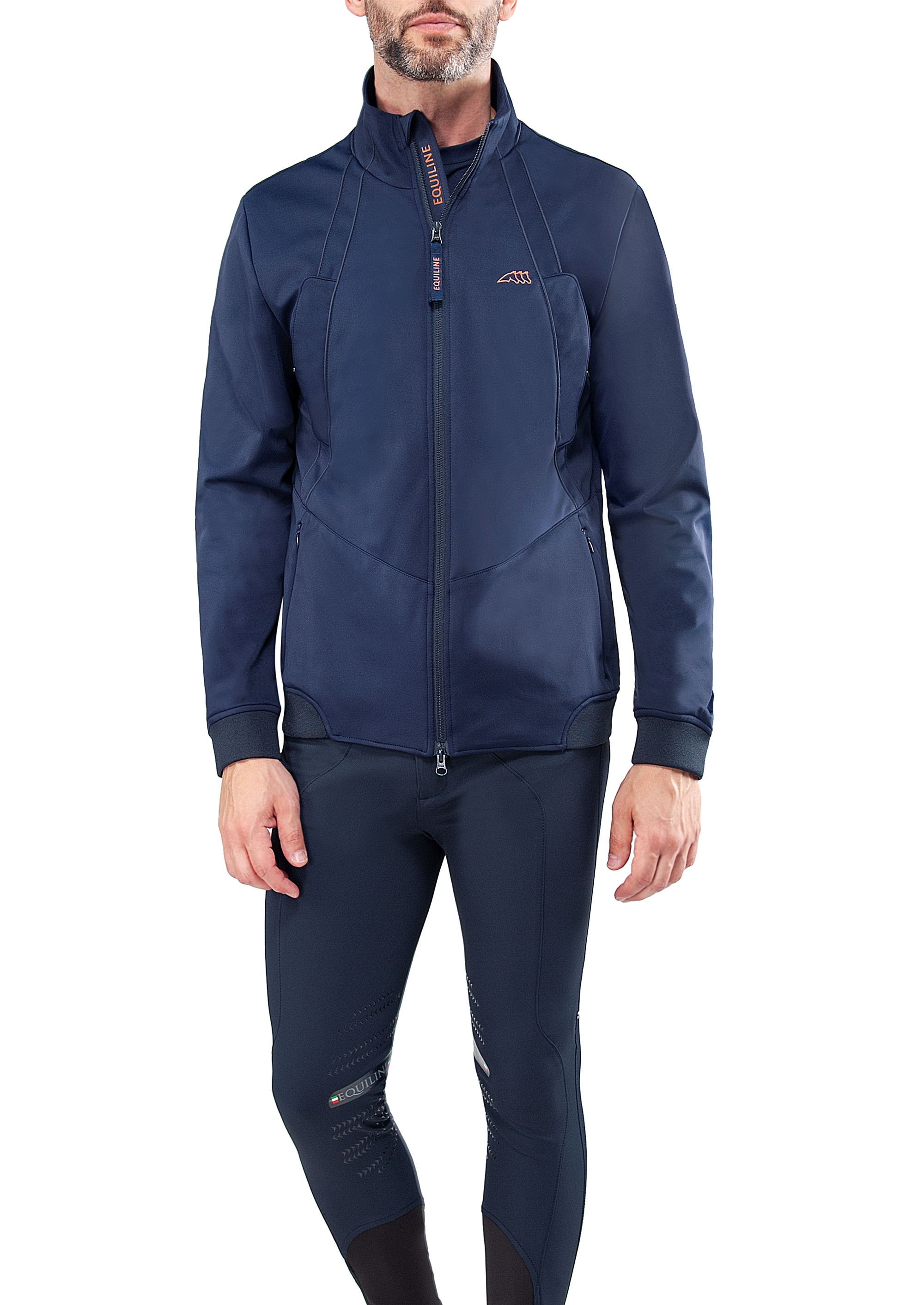 Equiline Curtis Dual-tech herre jakke er en teknologisk jakke i Equilines lækre soft-shell materiale. Denne jakke er smart og velsiddende. Equilines Curtis jakke er i materialet Dual-tech, som er super stretchy og meget åndbart. Det er vandafvisende og fungerer som wind-breaker. En meget blød og behagelig jakke. En let jakke som samtidig er meget funktionel og smart. Klassisk navy farve med Equiline logo ved venste bryst i orange. Flere lommer både med lynlås og knapper, så der er masser af plads til mobil, pung, nøgler mm.