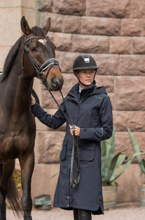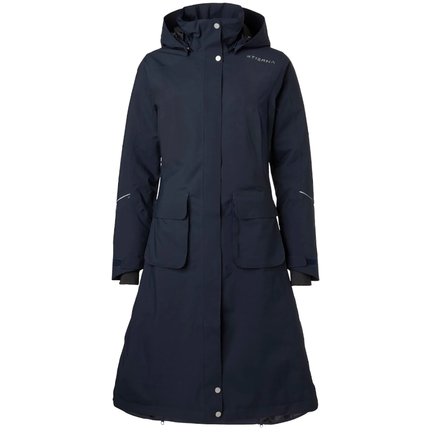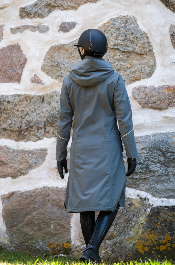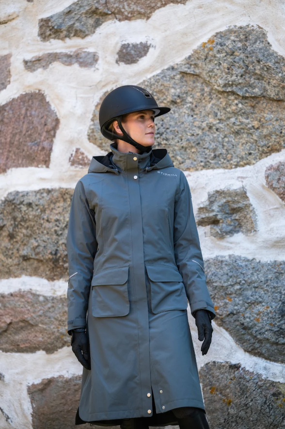 Denne stilfulde frakke er vand og vindtæt med fuldt tapede sømme. Den er åndbar og teknologisk. Materialet er blødt og lækkert- ikke plastic eller neylon agtigt. Og Frakken beskytter dig mod vand og vind samtidig med at du kan ånde - så den er yderst behagelig at have på. Med denne frakke kan du gå igennem selv de værste vejrforhold. Ydermere er Stierna Nova Rain Coat pæn og med flot pasform! Derfor også særdeles velegnet til hundeluftere, forældre, ridelærere m.m.
