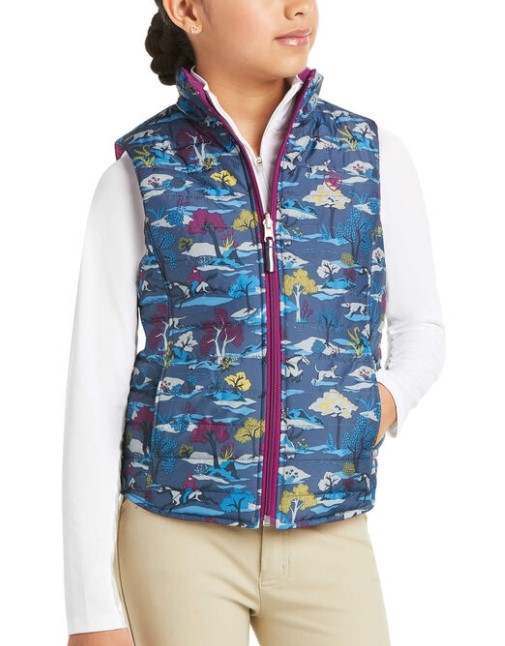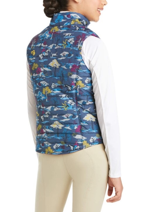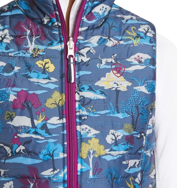 Ariat YTH Emma Insulated Reversible Vest - dette års efterårskollektion AW20 byder på denne flotte farvestrålende børnevest med heste motiv. Vesten er vendbar. Denne vest fungerer super som en "bodywarmer" året rundt. Den holder overkroppen lun under ridning selv på de koldeste dage. Se str skema billede nr. 4.