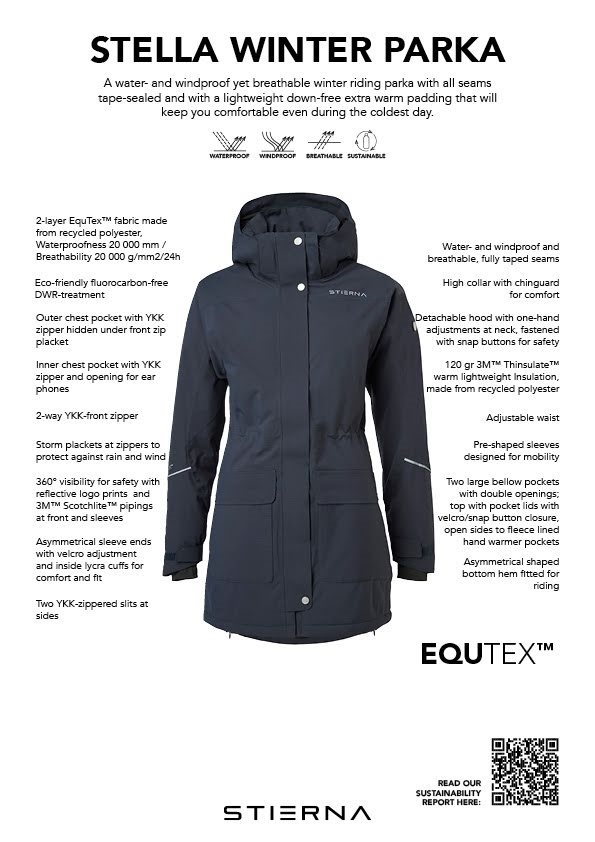 Stiernas vinter rideparka er en helt fantastisk jakke både til ridebrug men også bare til dig som ikke har lyst til at fryse. Stierna rideparka er med 2-lags EquTex og med extra varm 3M Thinsulate letvægtsforing. Jakken er vand- og vindtæt med høj åndbarhed og tapede sømme. Denne parka er ikke kun praktisk- den er også flot og klassisk at se på og kan derfor bruges også til hverdagsbrug, hvis man søger en varm og vandtæt jakke. Afgagelig hætte og justerbar talje.
