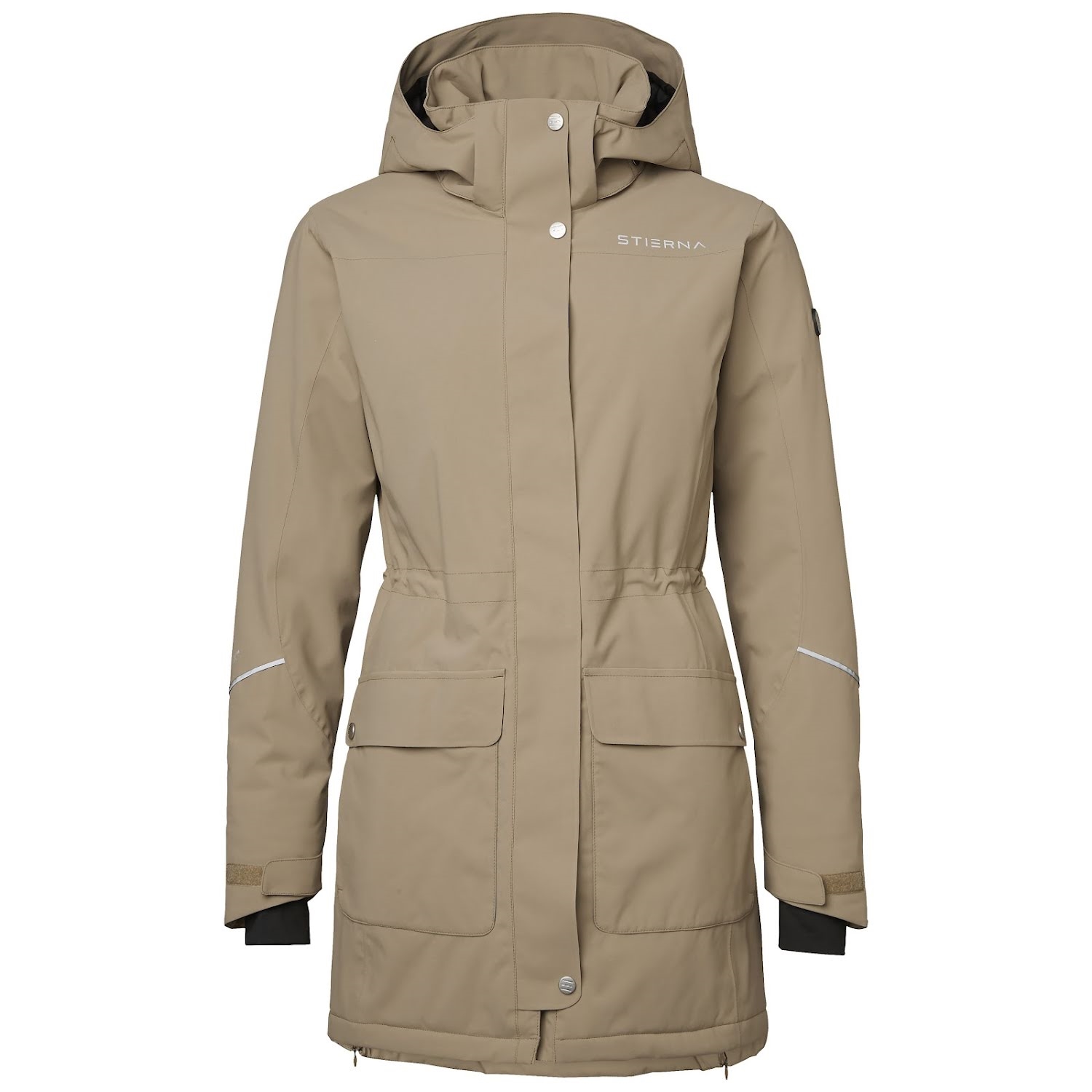 Stierna bruger meget tekniske materialer, og deres overtøj er nok det mest solide, vandtætt og åndbare på markedet. Materialet er EquTex i 2 lag med vand- og vindtæt membran. Vandsøjletryk på 20 000 mm / Åndbarhed 20 000 g/mm2/24h. Foringen er med 120 gr 3M Thinsulate ECO Classic letvægtsforing.
