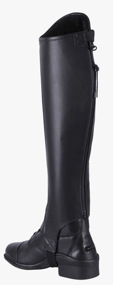 QHP Bodine vinterleggins. Lækre og varme leggins til at udstå vinterkulden. De er af elastisk, lækkert kunstlæder, der giver et godt fit på benet, og læder på indersiden af koskind, så de er mere slidstærke. Indeni er de forede med "fake fur" af polyester, så du nemmere kan holde varmen. De har en lynlås bagtil, der for oven har en elastisk knaplukning. Fås kun i sort.
