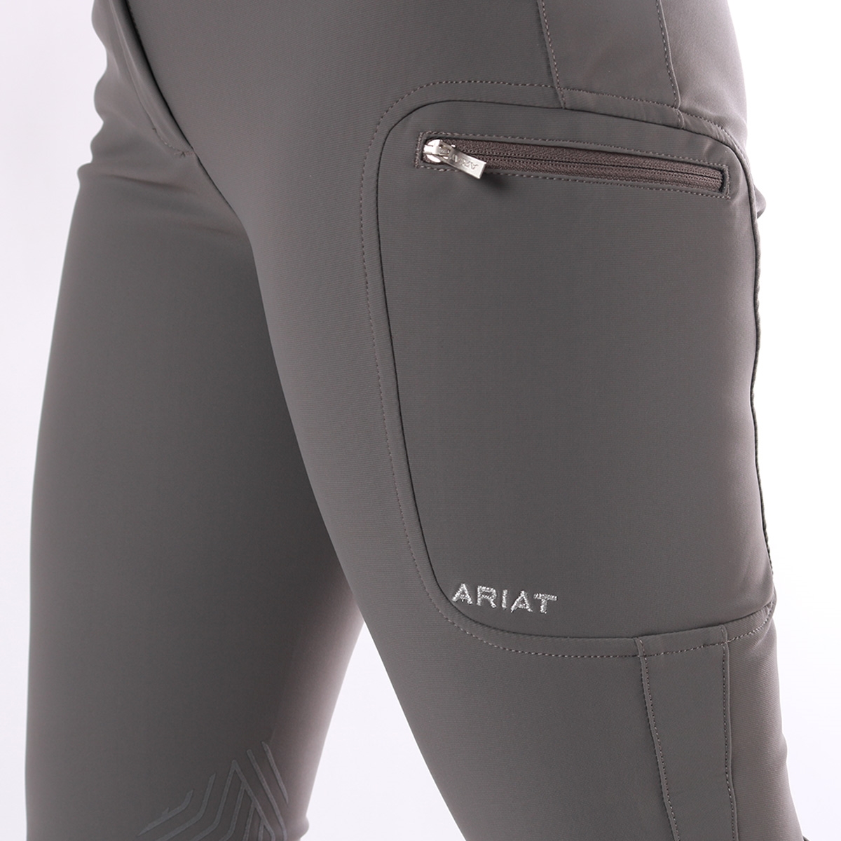 Ariat Triton har lynlåslomme på siden af låret til mobiltelefonen. Knægrip er som Ariats sædvanlige grip effektivt uden at være klistet. Nederst på læg i buksebenene er der et stretchy og elastisk mesh materiale som gør bukserne endnu mere behagelige. Materialet har kompression som giver en super pasform.