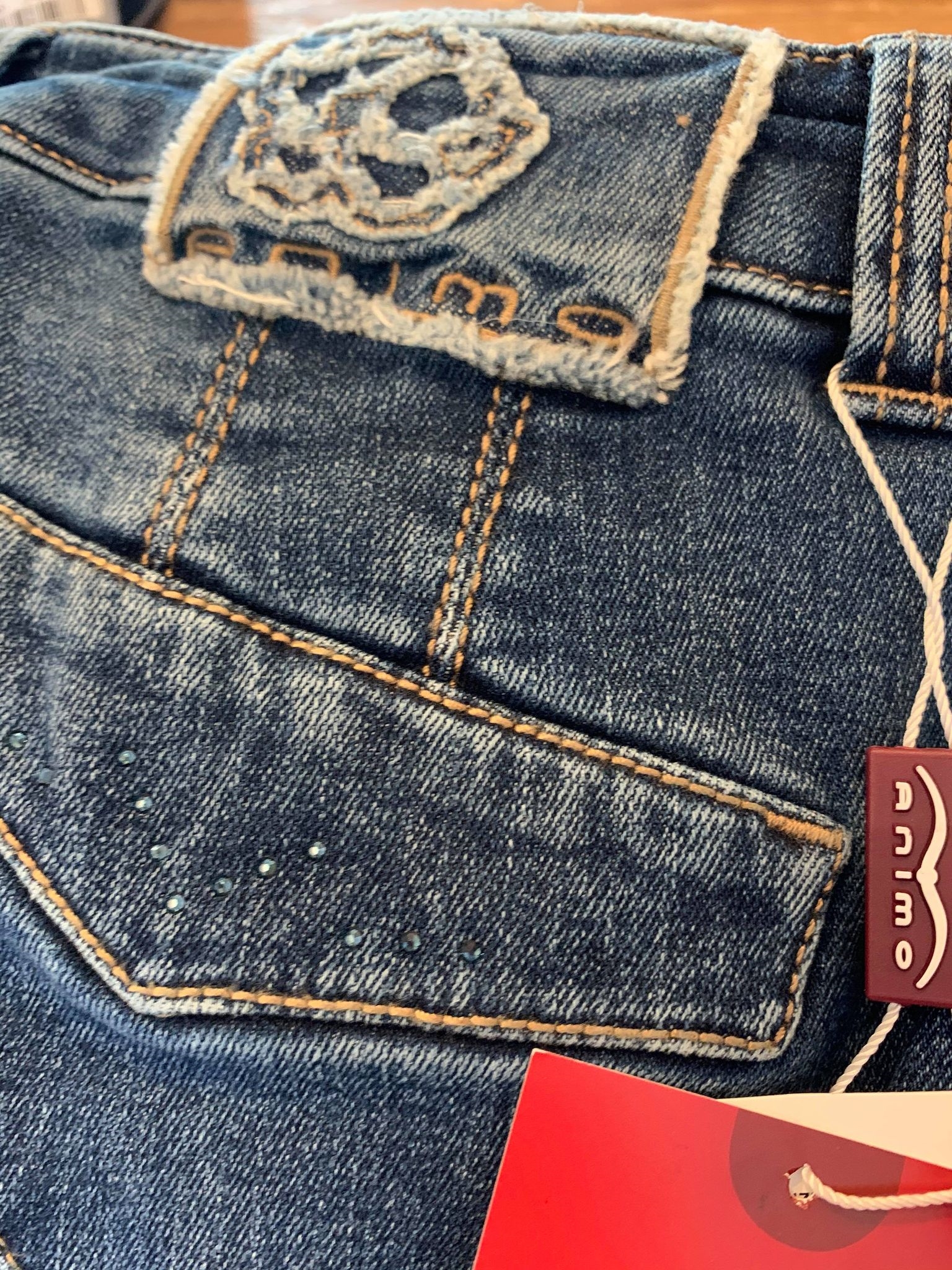 Animo Nesy jeans med knægrip er ridejeans som du ikke har lyst til at tage af! Animo har lavet jeans lige så længe vi kan huske - og de er kun blevet bedre og bedre. Pasformen og komforten er i top- materialet er super elastisk og de sidder simpelthen så flot. Denne version Nesy har lidt swarowski sten på baglommerne og Animo mærket over højre lomme ses på 3.billede- det er ikke helt korrekt som billedet af hele buksen ser ud. Dette er et par jeans du kan ride med eller gå ud og shoppe med. Og du vil elske dem.