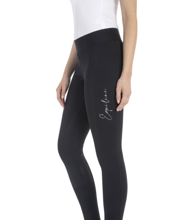Med disse tights melder Equiline sig ind i kampen om de fedeste ridetights! De er super behagelige og velsiddende- tilpas stretchy og tynde UDEN at være gennemsigtige og alt for afslørende. Der står Equiline i let glitrende materiale på venstre lår. Disse tights har fullgrip samt lomme til mobiltelefonen. Lækre detaljer og meget klassisk look. Størrelserne er Italienske så de fleste passer 1-2 numre større end de plejer at bruge.