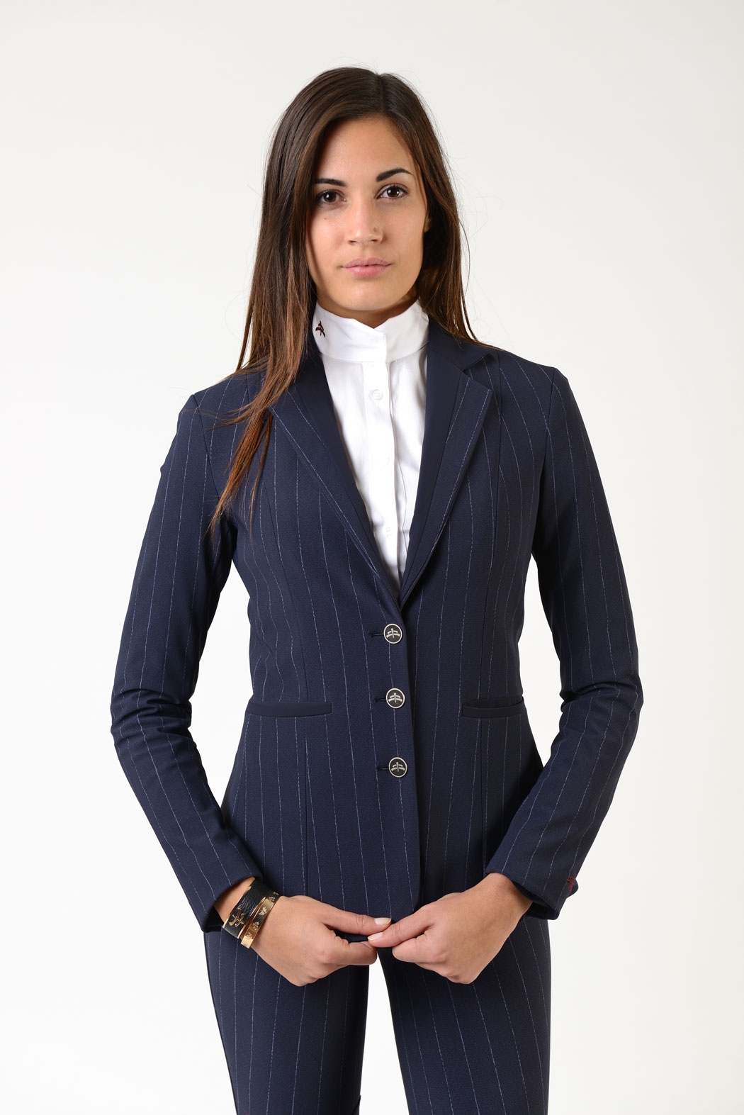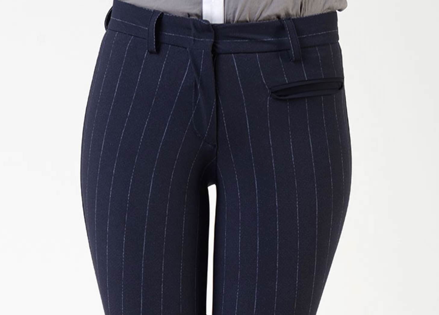 MakeBe Penelope med knægrip og mellemhøj talje er en super elegang og komfortabel ridebuks som fås i mange farver. Haves farven ikke hjemme kan den bestilles. Der findes en ridejakke i blu pinstripe som matcher bukserne- den kan bestilles. Ring eller skriv jg@tattersall.dk