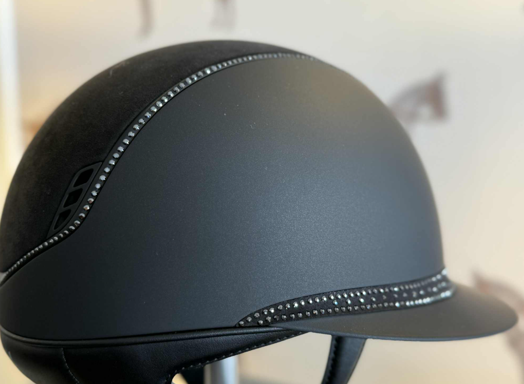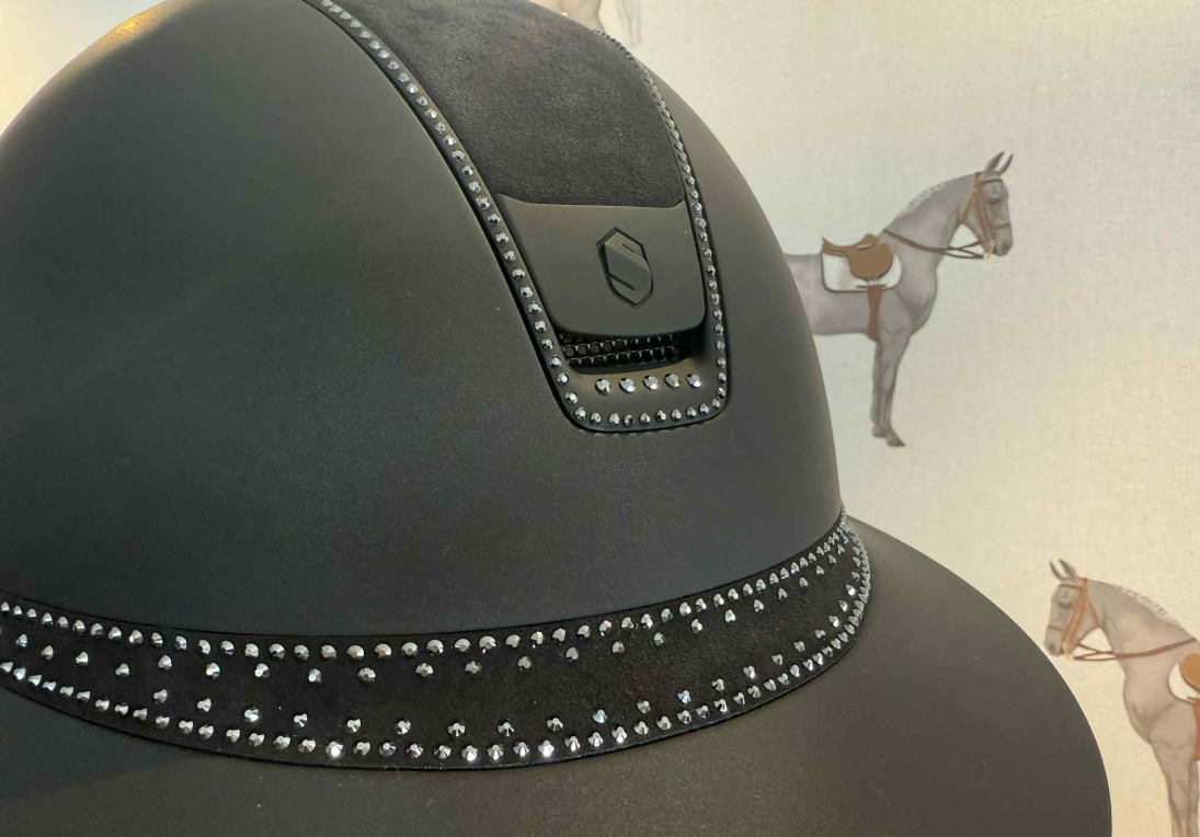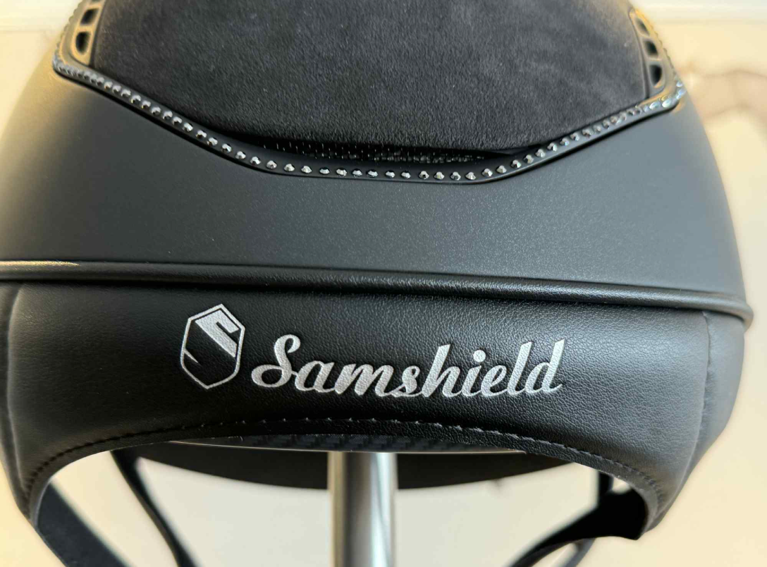 Samshields V2 Miss Shield shadowmatt sort med top i sort alcantara og frontbånd med Tiara. Blazon er matt sort og så er der ekstra swarovski både 5 stk på blazon samt hele 300 glitrende sten lagt ind i den mørke trim. En virkelig smuk og klassisk hjelm. Denne hjelm er med dressur cut bagtil, så der er god plads til håret.
