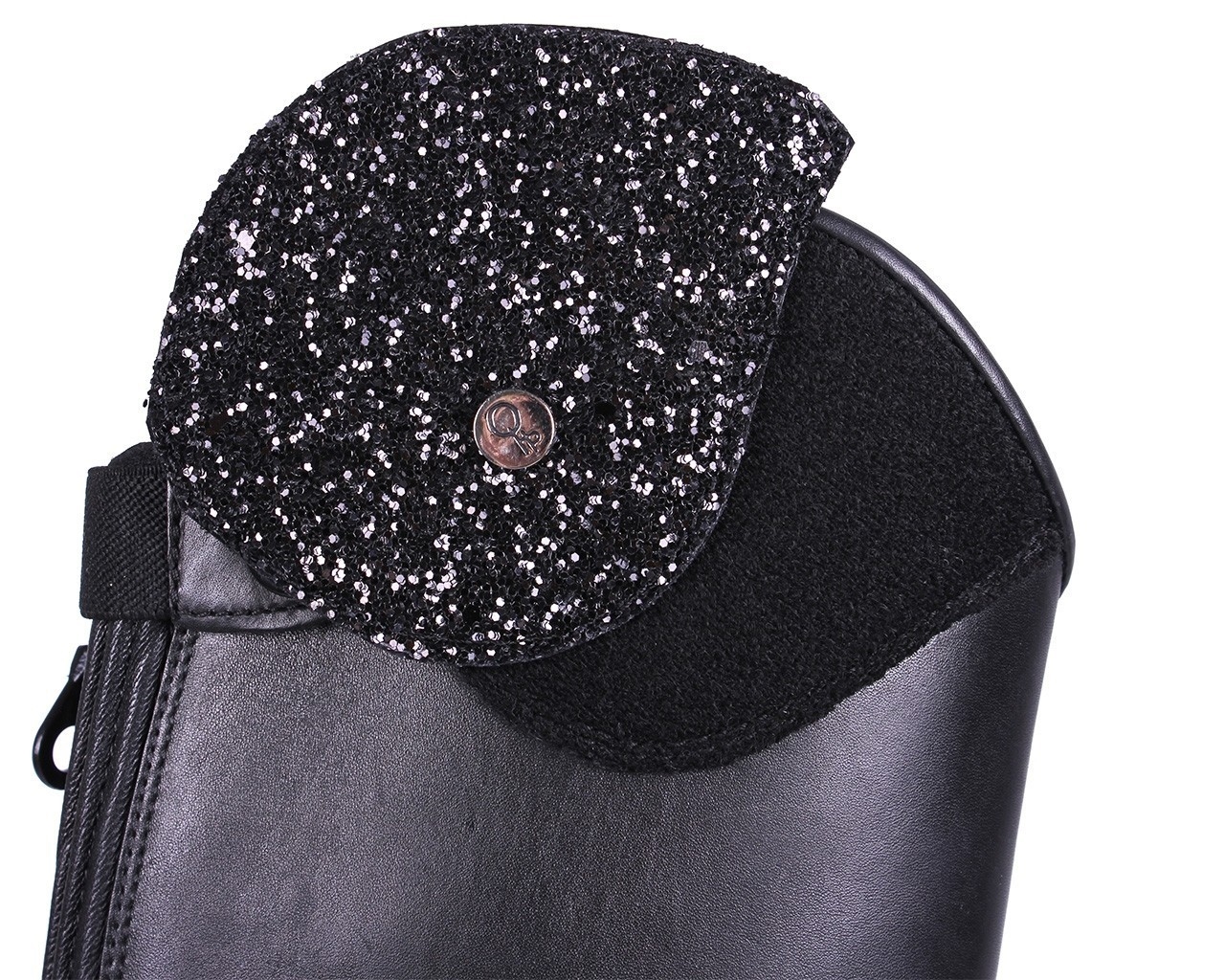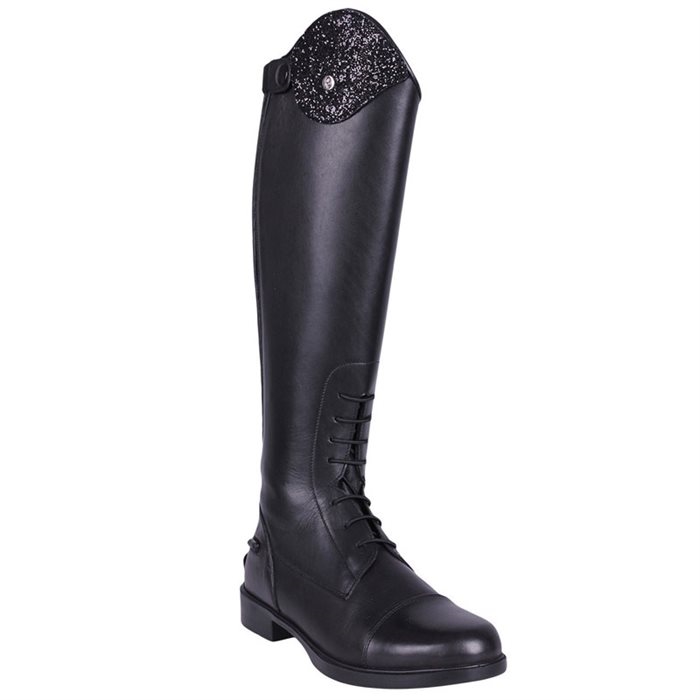 Lækre ridestøvler hvor pynt på toppen af buen sidder med velcro og kan udskiftes således, at udsmykning kan ændres. Støvlen er fremstillet i ægte læder og har gummisåler. Støvlen har snørrer, sporeholder, lynlås bag på samt elastik langs lynlåsen.