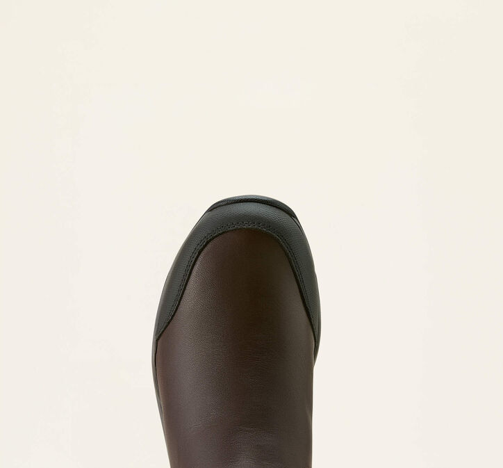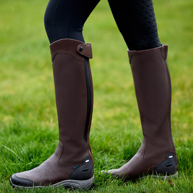 Støvlen åbnes og lukkes bagtil med gennemgående lynlås, og langs lynlsåen er et stykke elastisk materiale som sikrer god pasform og komfort. Hælen er stigbøjle godkendt. Støvlen er af læder med et lækkert lidt råt look. Inderfor er fugttransporterende og åndbart materiale.