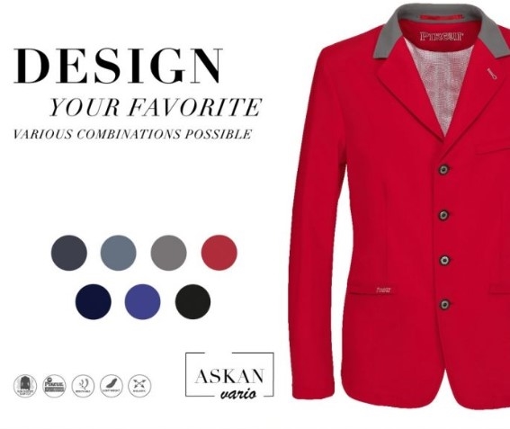 Pikeur Askan herre jakke specialdesignet rød med sort krave (ikke som på billedet hvor den er grå). Varianten her er især lavet til vores jagtryttere. Den er flot rød med sort krave og en populær jakke hos herrer der rider jagt og ridebanespring Kraven er sort- ikke grå som på billedet her). Askan er en super lækker ridejakke, som er flot enkel i snit og fremstillet af et meget lækkert teknologisk materiale som er elastisk og åndbart. Jakken har klassiske lommer med skjult lynlås, mesh foring og slidser i siderne. Et tyndt velsiddende softshell materiale som også kan vaskes ved 30 grader.