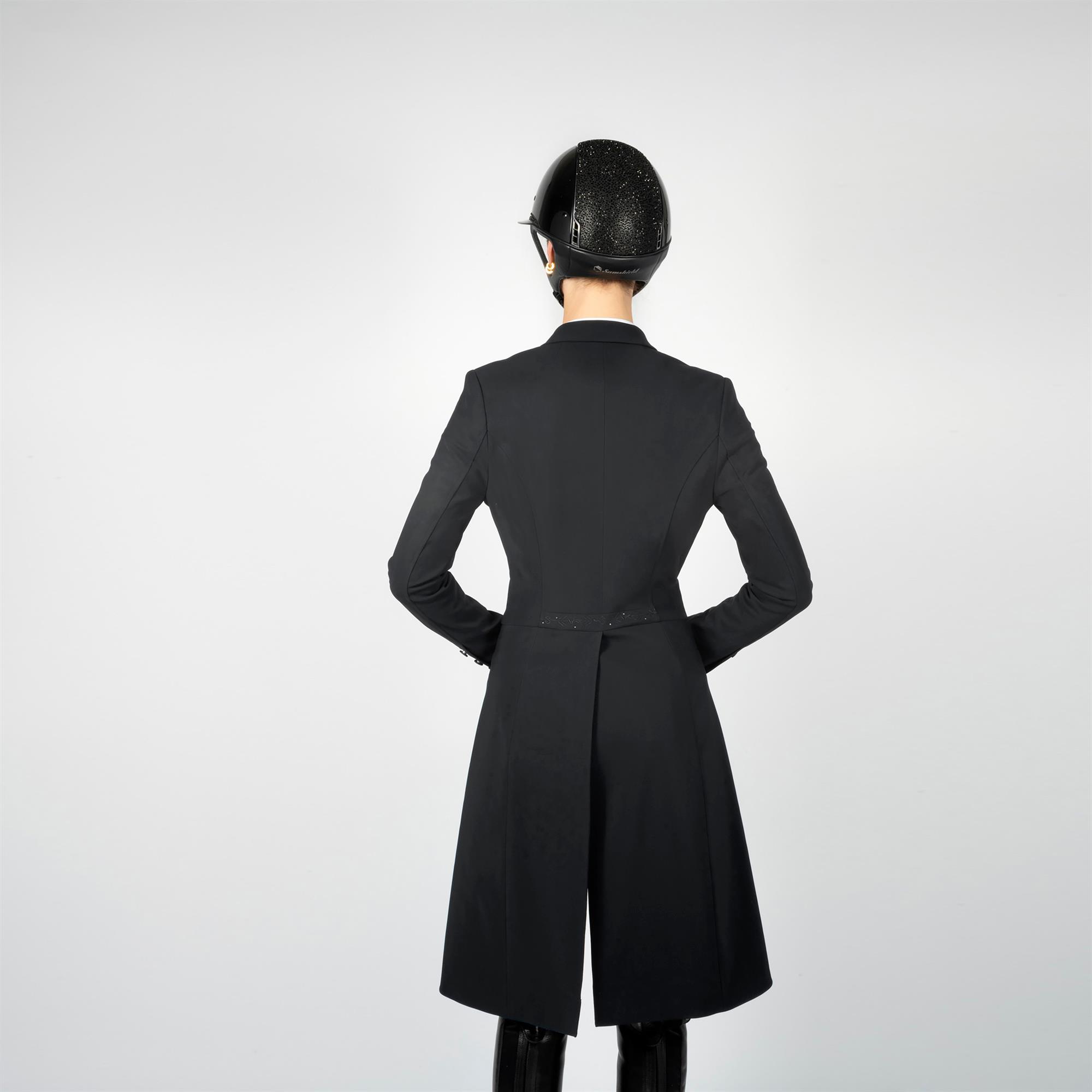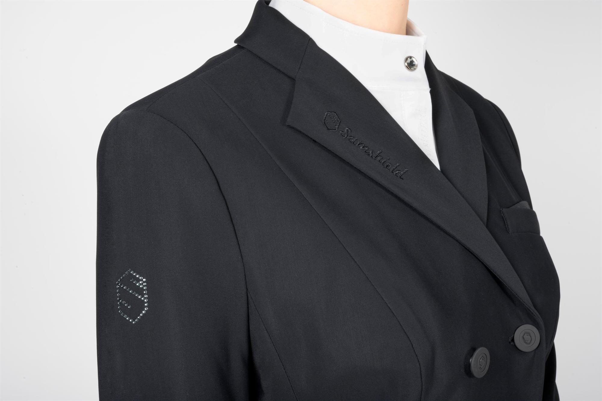 Samshield Frac Jully - den ultimative dressurkjole som oser af elegance og stilfuldhed. Denne kjole er en del af Samshields SS22 kollektion og derfor er der kun et begrænset antal. Jully dressurkjolen er ualmindelig smuk og enkel. Den er velsiddende og flot men meget enkelt udsmykket. På højre overarm ses det klassiske Samshield logo i små Swarovski sten. På ærme manchet og bagpå over lænden er der et fint og enkelt broderi kombineret med Swarovski sten. Dressurkjolen Jully har Samshields Alcantara på ærmekanterne, hvilket giver et klassisk look og gør kjolen praktisk.