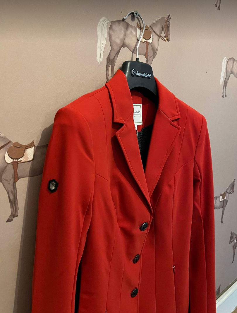 Samshield Frida Sport er en af de mest enkle stævnejakker fra populære Samshield. Og den er rigtig danskerrød! Så skal du ride nationsspringning eller synes du også bare det er mega flot med rød, så er dette en genial stævnejakke. Du kan også bruge den til jagt men skal så selv få sat sort på kraven. Samshield Frida Sport er helt uden bling-bling. Det her er en meget enkel og velsiddende stævnejakke i Samshields populære materiale. Samshield Frida Sport tilbyder rytteren et klassisk og stilfuldt snit. Stævnejakken har to diskrete lynlåslommer udvendigt. Den er lidt længere i kroppen end modeller som Victorine for eksempel. Et godt valg til rytteren som kan lide det stilrene look uden at gå på kompromis med funktionaliteten, da jakken ud over at være elegant på også giver god bevægelsesfrihed og så er den til at trække vejret i.