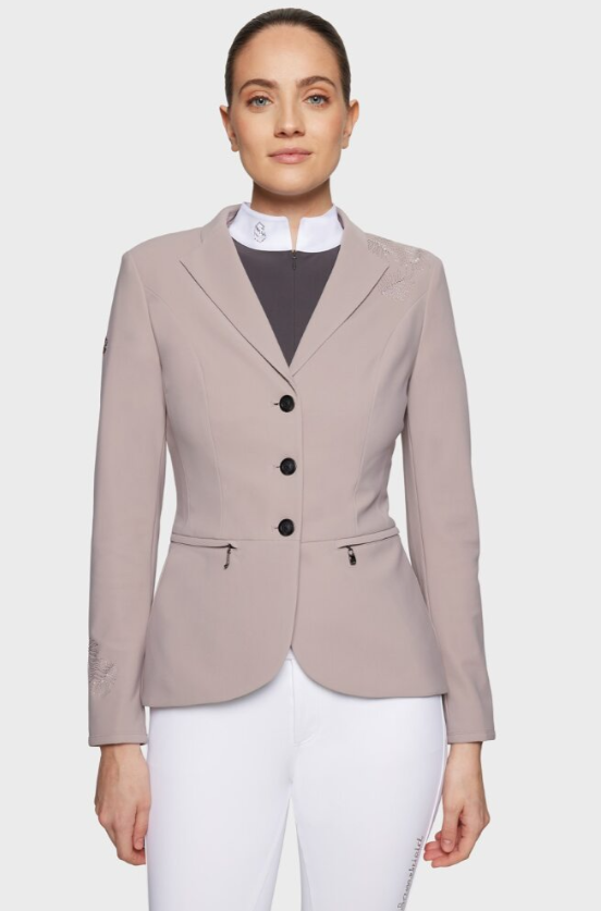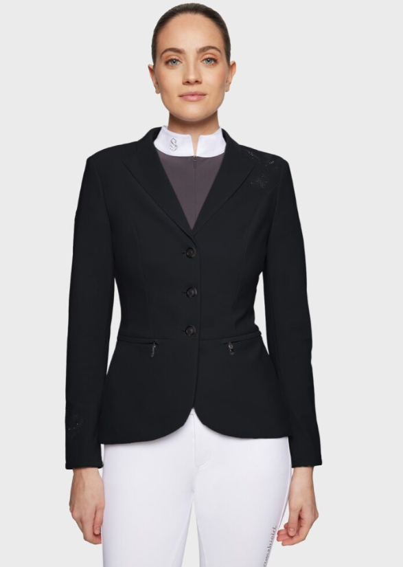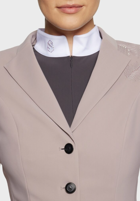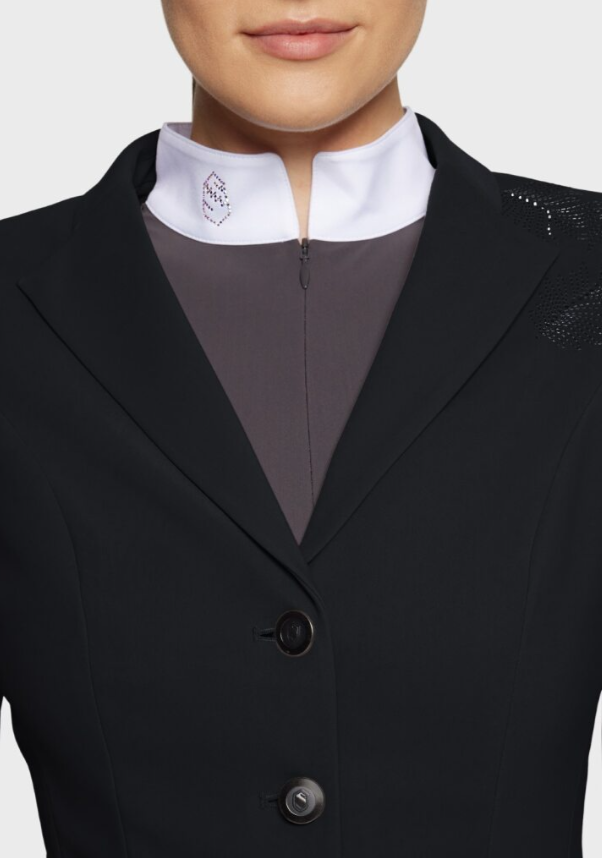 Samshields stævnejakker er velsiddende og behagelige. Materialet er let og tilbyder rytteren masser af bevægelighed, det er åndbart og klædeligt. Pynten på denne stævnejakke er helt unik og meget stilfuld, til dig som har ønske om noget helt særligt.
