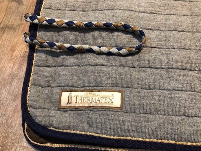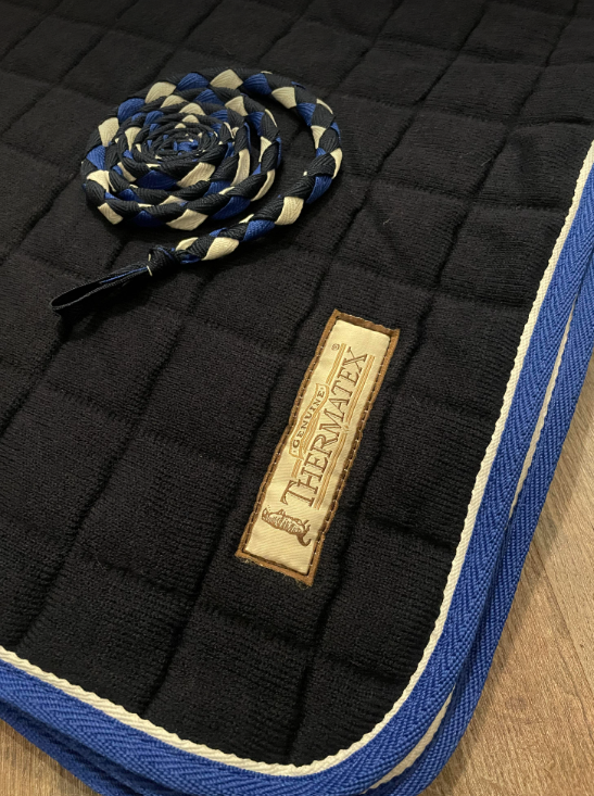 Thermatex lændedækken med det normale kantebånd men så er der også pipe på, som giver dækkenet et mere unikt og eksklusivt look. Desuden er det nemmere at kende, hvis man vælger en lidt unik farve - Thermatex er et eftertragtet dækken, og ofte kommer ryttere til at forveksle dækkenerne- det er nemmere ikke at miste sit dækken, hvis det ikke ligner alle de andre!