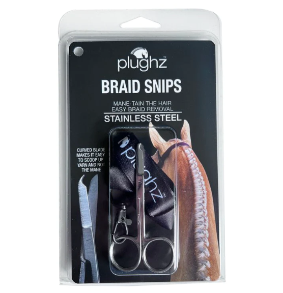 Plughz Braid Snips er en saks som er den perfekte hjælp til at få rosenknopperne op uden at ødelægge manen og pandelokken. Det er en saks med bue på spidsen som gør det nemt at klippe tråd og elastikker uden samtidig at klippe manen af. Der medfølger en strop man kan sætte på, så man kan have saksen hængende om halsen imens man fletter hesten/ponyen op.