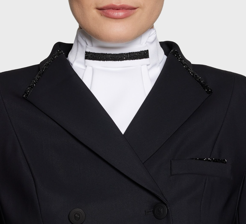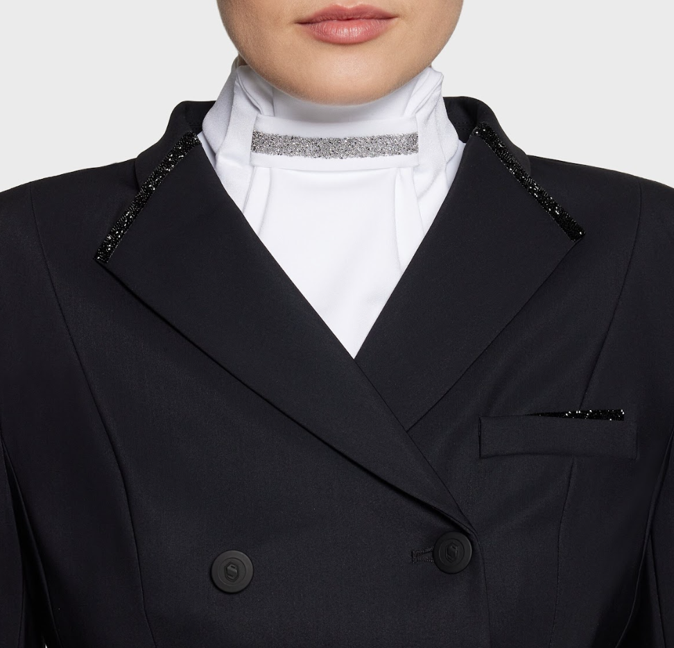 Samshield plastron crystal fabric - en velsiddende og lækker plastron med pynt foran med Samshields crystal fabric, som også findes på deres ridebukser og stævnejakker.