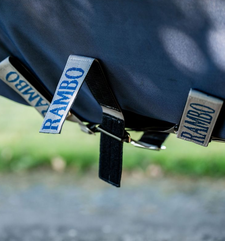 Dækkenet har Rambo Surefit Neck Desing med V-front lukning + leg arches som alt sammen giver din hest masser af bevægelsesfrihed på folden når der skal græsses, løbes og rulles.