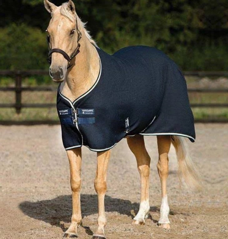 Rambo Techni Waffle Cooler- lækkert dækken i vaflet kvalitet. Et dækken som er velegnet til transport eller til brug i stald på varme dage. Fungerer godt som cooler og til efter vask. Og du kan også bruge det som skridtdækken. Mange muligheder for brug med dette skønne dækken. Findes i flere størrelser. Klassisk navy med beige, lyseblå og navy kant. Spørg gerne hvis du skal bruge andet end det vi har på lager. Så bestiller vi gerne hjem.