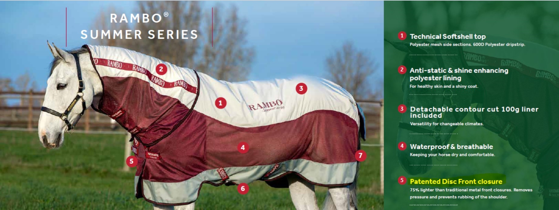 Horseware Rambo Summer Series har et vandtæt og åndbart softshell materiale på oversiden, og der er en aftagelig liner på 100 gr under, så dæknet kan være lunt over ryggen og krydset. Dækkenet er meget åndbart og en super løsning forår/sommer hvor temperaturskift og bygevejr præger hestens udeliv.