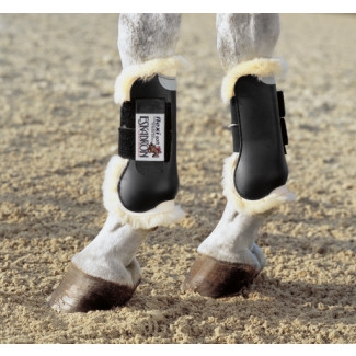 Eskadron Flexisoft gamache med ægte lam. Disse Eskadron Fleixsoft gamacher har ægte lam i hvilket er skånsomt over for hestens ben. Flexisoft gamachen er udviklet i samarbejde med Ludger Beerbaum. Eskadron Flexisoft gamache har et fleksibelt blødt område øverst på gamachen og den tilbyder derved ekstra komfort og frihed til hesten. Det er er gamache som er beskyttende og den ligger godt på hesten. Eskadron Flexisoft gamachen er et resultat af mange års erfaring med at producere top produkter til heste - forenet med erfaring og input fra en af verdens bedste ryttere, Ludger Beerbaum.