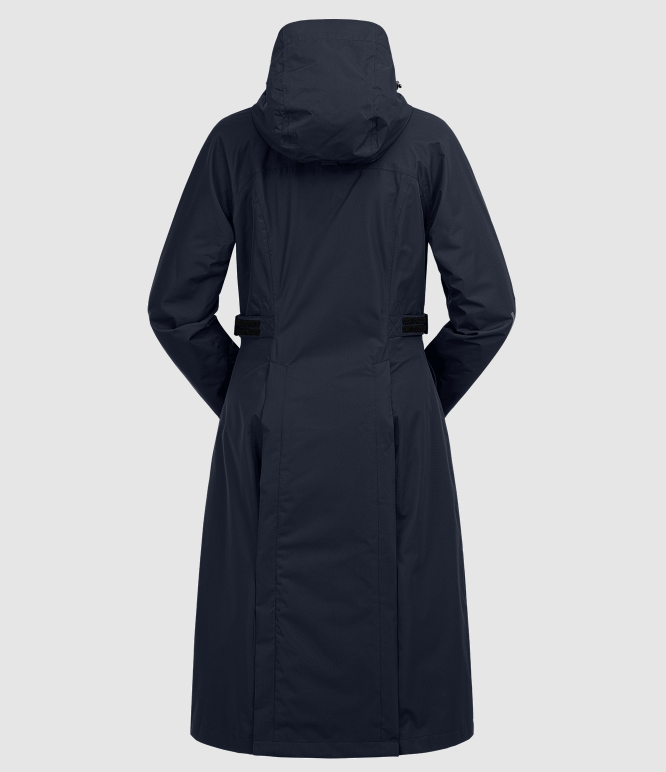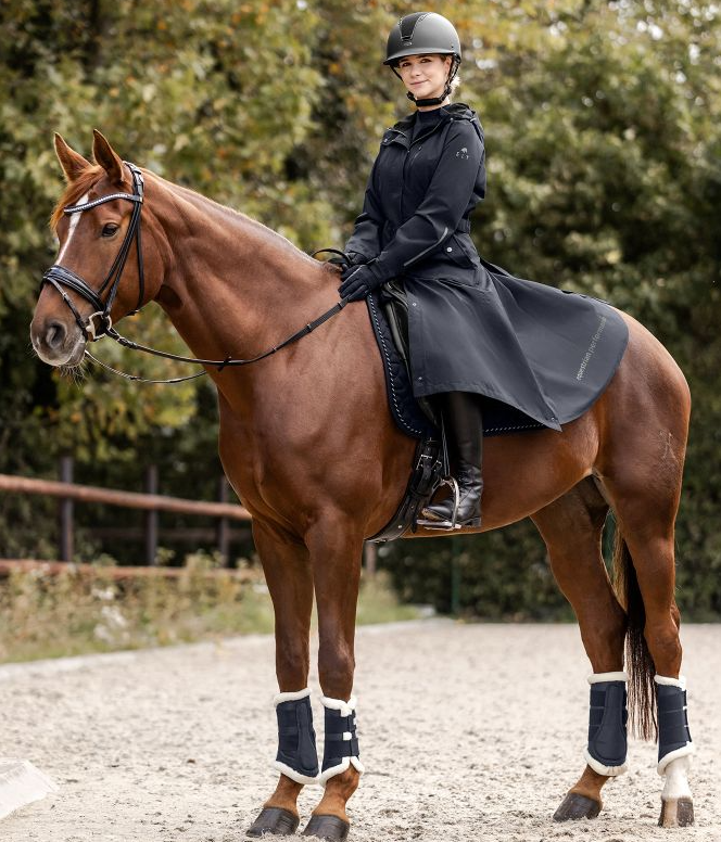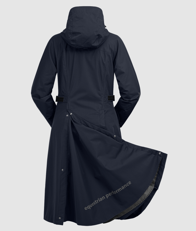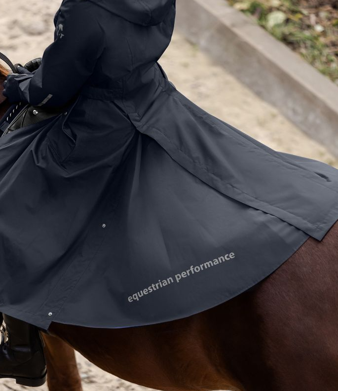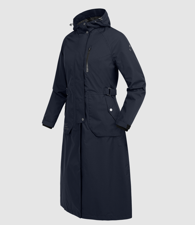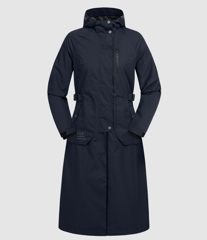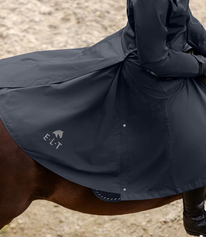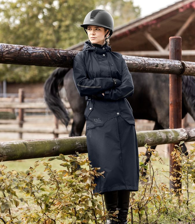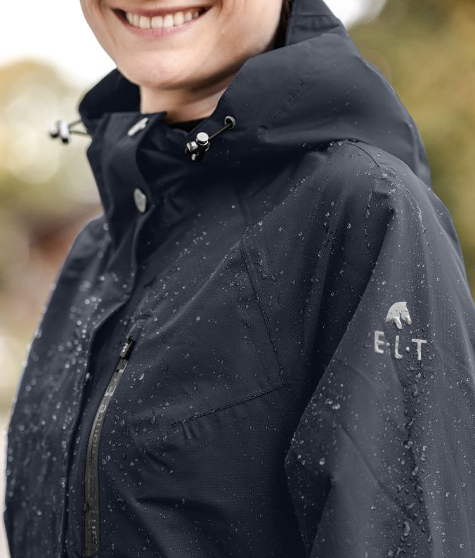 ELT Fehmarn regnfrakke i en ny opgraderet version. En super funktionel regnfrakke med alle de ønskede ridefunktioner. Frakken har justerbar talje og er velsiddende og klassisk, så den er også pæn uden for hesteverdenen. Fehmarn har et vandsøjletryk på 5000mm og åndbarhed på 3.000g/m²/24h. Frakken har tapede sømme, så i denne frakke får du virkelig en god regnfrakke til prisen. Den erogså vindtæt. Kraven har blødt microfleece på indersiden. Hætten er stor nok til at komme ud over en hjelm. Hætten kan fastgøres på ryggen. Fehmarn frakken har en god 2-vejs lynlås den lukkes med foran. Slidser, benstropper og gode afslutninger som sikrer, at sadel ikke beskadiges af lynlåse. Frakken har også en brystlomme med vandtæt lynlås. Store rideslidser samt refleks logoer som giver ekstra synlighed i mørke.