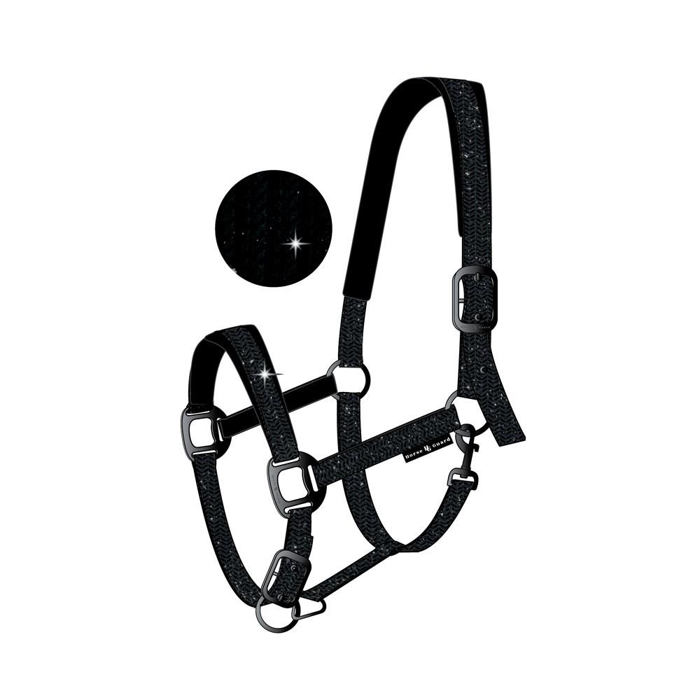 HorseGuard Jewel grime med elegant glimmermønster. Næse- og nakkebånd samt kindstykker er forede med neopren.