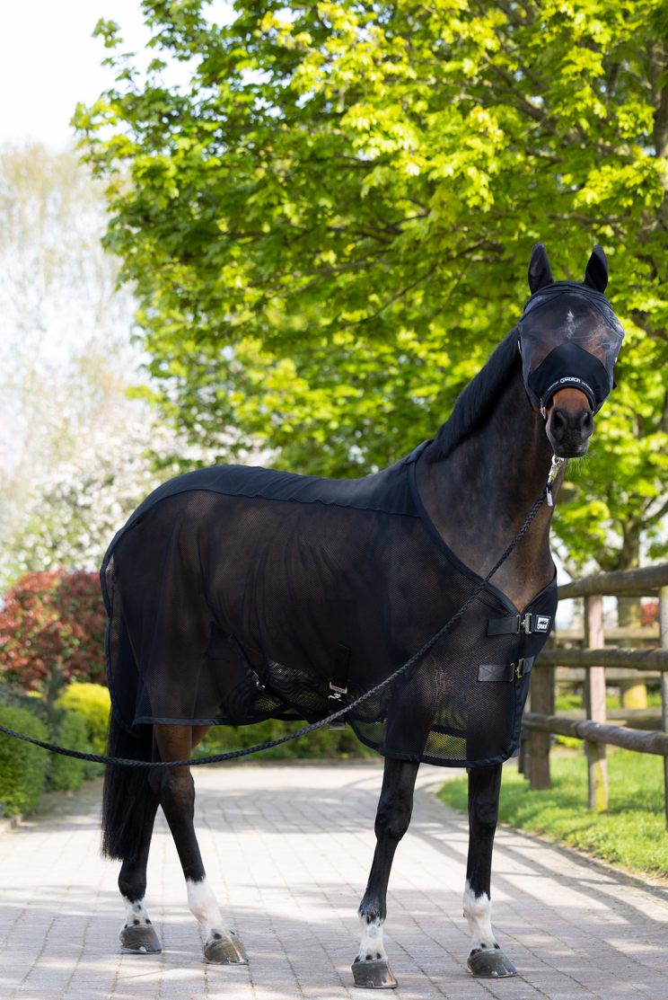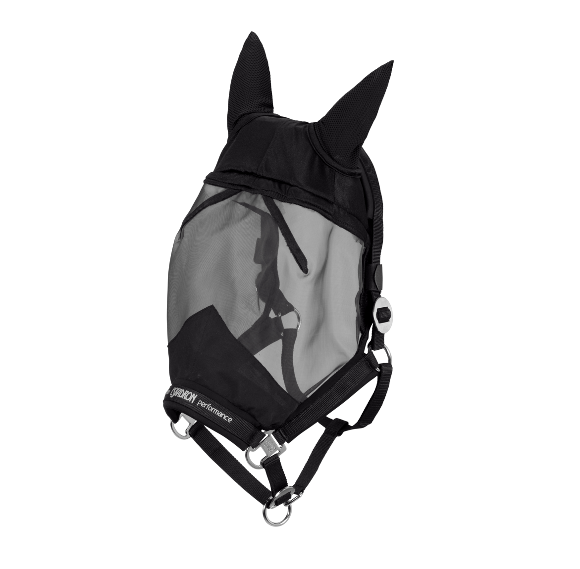 Eskadron Basics grime med integreret fluemaske. Virkelig lækker og velsiddende og i behagelige materialer. Eskadrons grimer sider godt og denne har så lækkert stretchy mesh som ører samt finmasket fluemaske med blødt materiale på indersiden. Det her er praktisk luksus til din hest. God kvalitet får man altid fra Eskadron.