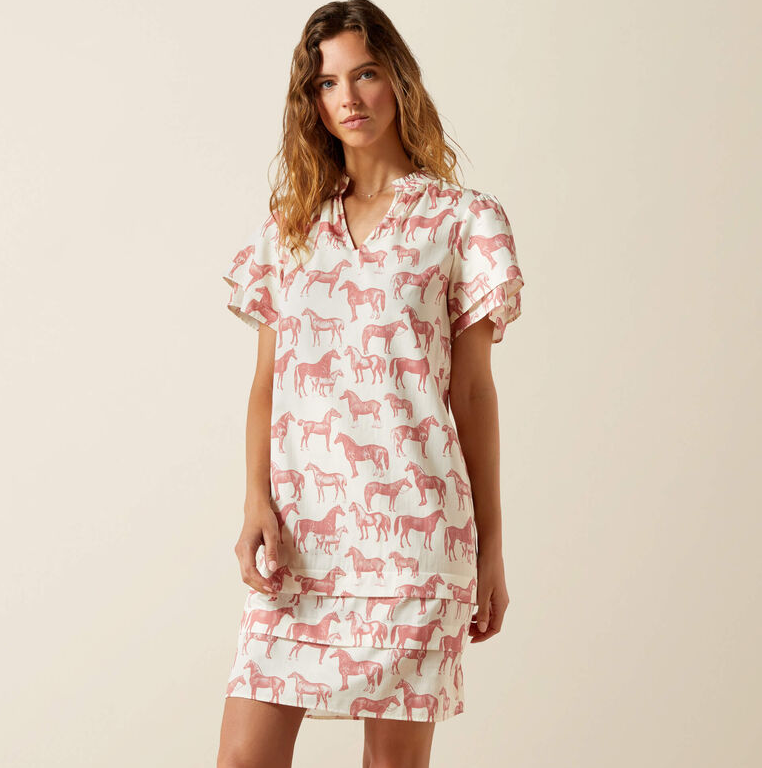 Med en kjole som denne vil ingen være i tvivl om din kærlighed til heste! En klassisk og lækker kjole med fint hestemønster. Whats not to like? En feminin kjole som er knælang og i et behageligt materiale. Kjolen er super fin både med støvler, sneakers eller sandaler.
