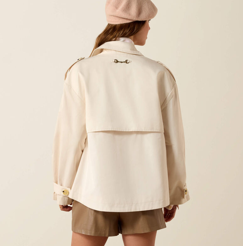 Staunton jakken er kommet i en ny farve Vanilla Ice! Skal du på galopbanen, til rytterfest eller vil du bare gerne have en ny jakke som kan bruges på utallige måder i garderoben? Totalt moderigtig og klassisk trench coat med A-facon. Lidt kort i det men rummelig og med brede ærmer. En jakke som er elegant og sporty på samme tid og passer til alle aldre! En skøn detalje er det fine inderfor som er med hestemotiv. Lidt stor i størrelsen, da den er rummelig i facon.