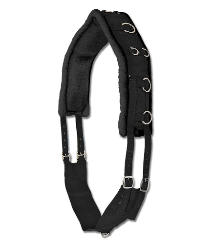 Waldhausen Longegjord med plys over ryggen. Gjordens ydre er lavet af slidstærkt nylon, hvor gjorden over ryggen er polstret med blødt plysmateriale. Den er justerbar i begge sider og har 13 ringe, så der er rig mulighed for at arbejde med den. Det er også muligt at benytte den med dobbeltlonge. Bredde: 10 cm.