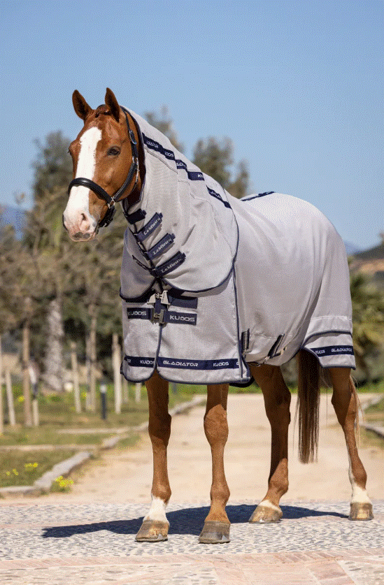 Kudos Gladiator fluedækkenet er det ultimative fluedækken lavet af den meget holdbare power form mesh, hvor vævningens struktur tilpasser sig hestens form over tid. Fremstilling i holdbar nylon og slidstærk monfilament polyester gør dette letvægts fluedækken meget åndbart og naturligt vandafvisende samtidig med, at det tilskynder hurtig tørring. Den forlængede flap under maven øger dækningen, og der er en tre-gjords lukning, hvor den midterste gjord kan tages af. Det vinklede frontlukningssystem fordeler trykket, så dækkenet ikke slider på skuldrene og henover bringen. Et todelt patenteret skørtesystem bryder sømmen på langs, hvilket mindsker trykket og giver en større bevægelsesfrihed.