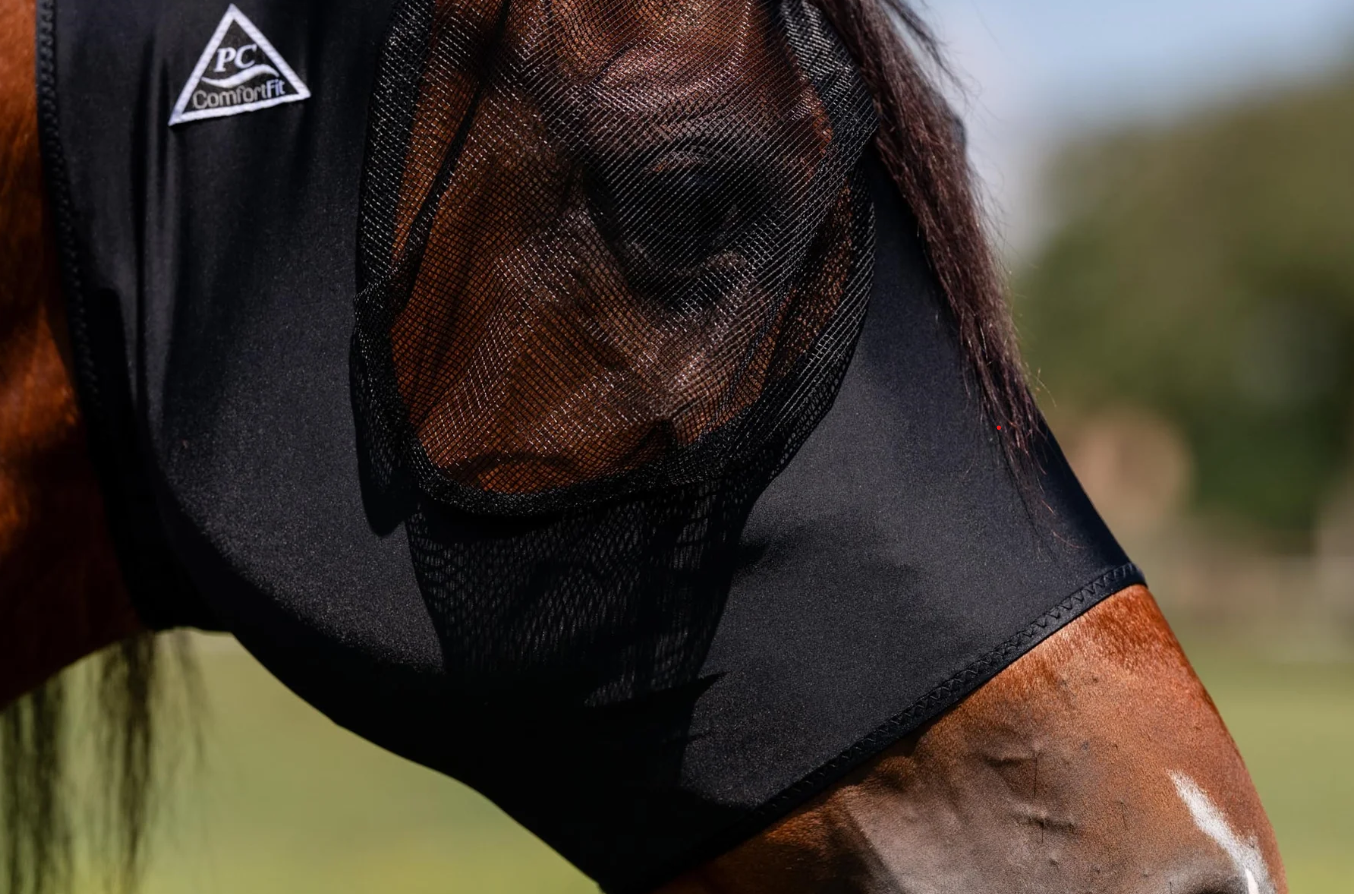 Comfort Fit er en fluemaske i blød 4-vejs strækbar lycra fra Professional's Choice. Masken sidder virkelig godt og former sig om hestens hoved. Det bløde net rammer ikke ind ved øjnene og generer derfor ikke. Hesten kan have fluemasken på under grimen uden problemer.