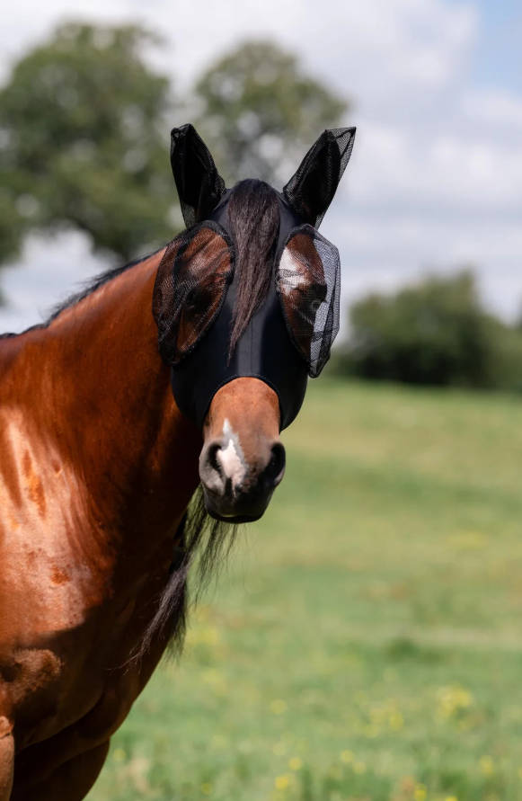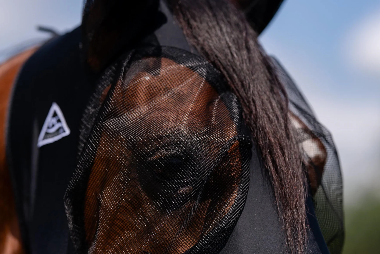 De meget lækre og populære fluemasker med behagelige lycra som sidder tæt og godt om hestens hoved, og net ved højne og ører som er blødt men solidt. Denne fluemaske er meget eftertragtet og findes nu med hul til pandelokken.