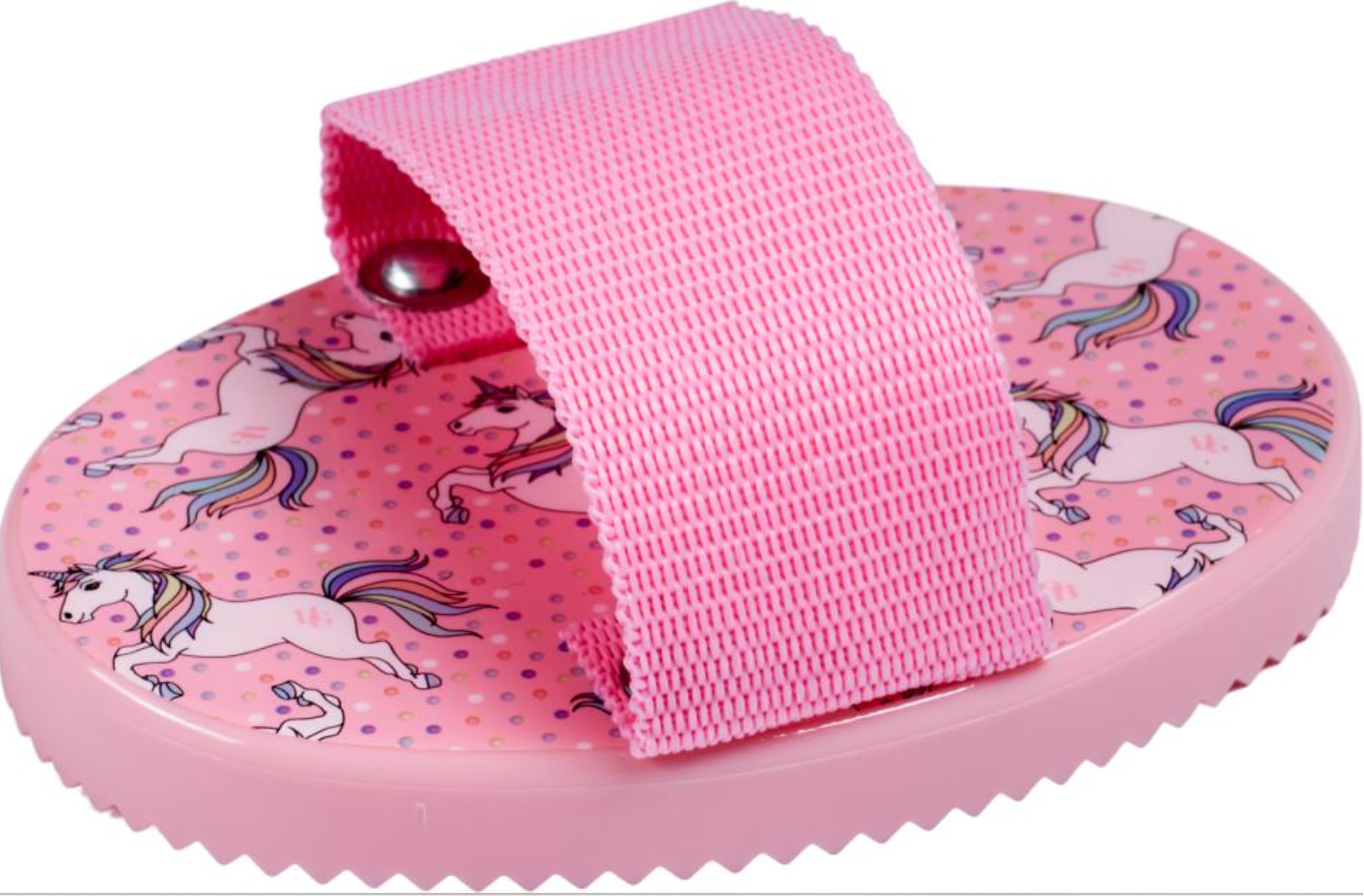 Gnubber i pink plast med enhjørninger på og i en lille størrelser, som passer godt til små hænder.