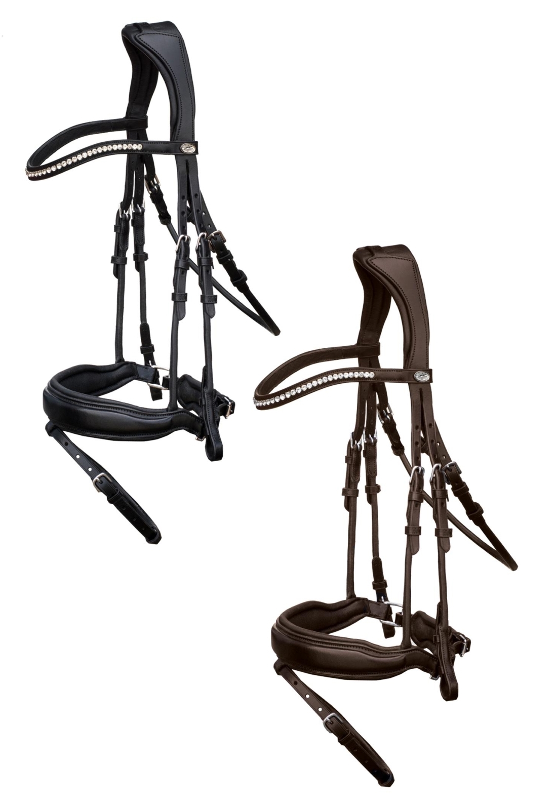 Schockemöhle Malibu er en lækker eksklusiv trense i blødt læder med anatomiseke detaljer, som sikrer optimal pasform på hesten. Malibu er yderst enkel og elegant. Den fås i flere farvevarianter: sort (cob-full- og extra full), espresso (cob og full) og i sort med lak på næsebåndet (cob, full og extra full). Schockemöhle Malibu har buet pandebånd med klare krystaller. Nakkestykket er anatomisk i pasformen og en del af nakkestykket er fremstillet i yderst blødt og fleksibelt materiale for at sikre mindst muligt tryk og pres på hestens nakke (se billede af nakkestykket ovenfra). Malibu næsebåndet er skåret med en smule "cut-back" så det ikke trykker på nerver ved kæben. Næsebånd og nakkestykke er virkelig blødt og lækkert. En flot trense som funktionsmæssigt kan noget helt særligt- og derfor er det ikke uden grund, at Malibu er en BEST SELLER hos Schockemöhle.