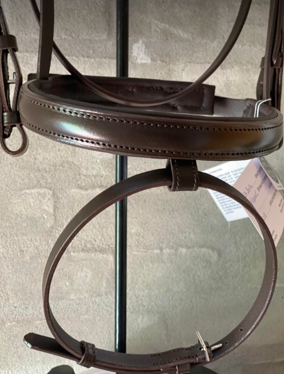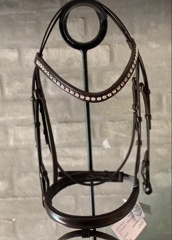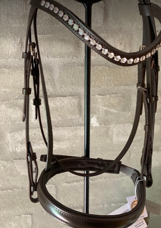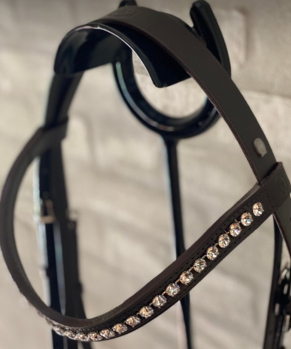OS Berlin trense med engelsk kombineret næsebånd 2,8 cm (uden tilbagetræk). Farven er mørkebrun (chocolat) med spænder i sølv. Pandebåndet er buet med 8 mm klare swarovski krystaller. Der mefølger web tøjler.