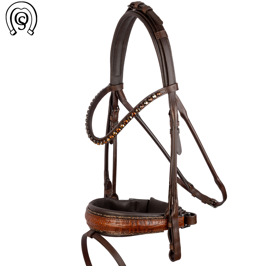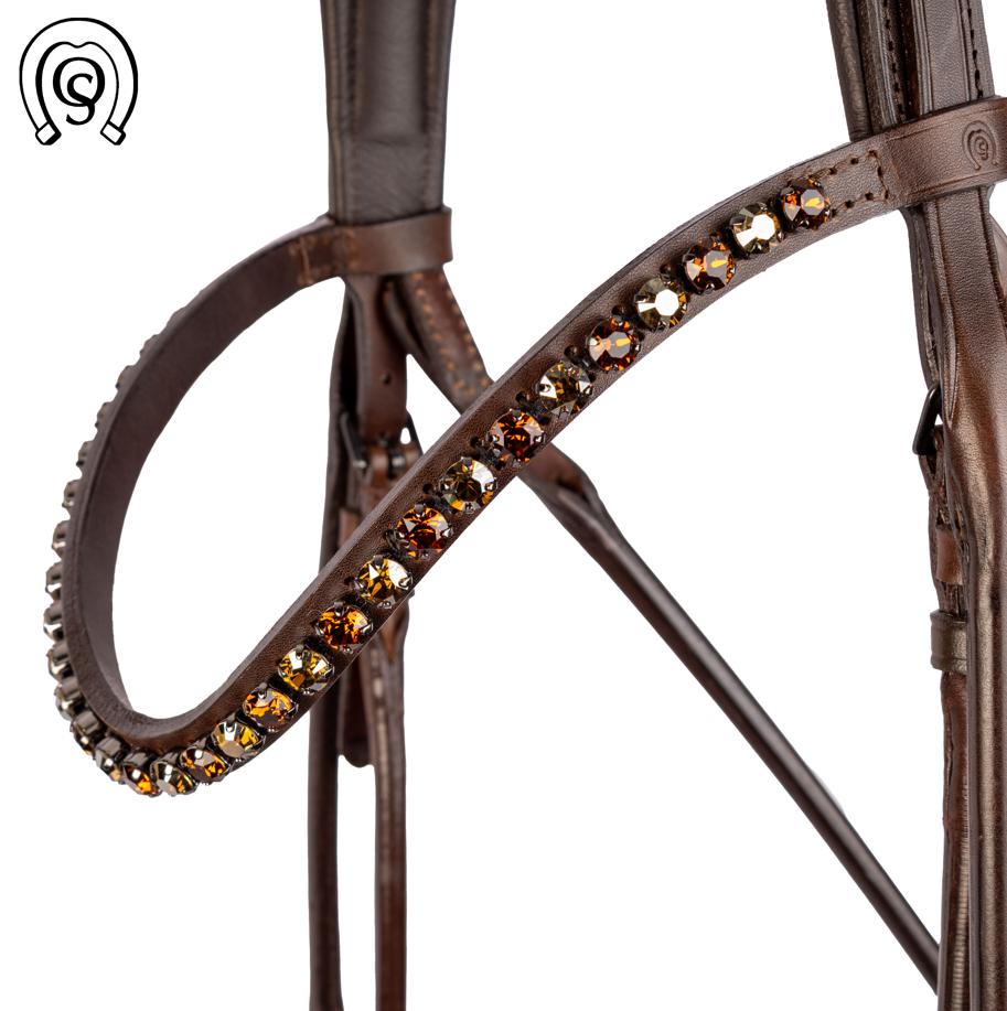 OS Genua er en eksklusiv rundsyet trense i smuk mørk brun farve. Trensen her er specialdesignet. Næsebåndet er anatomisk udformet comfort xs med "feel good" foring, som er helt uden syninger.Dette gør næsebåndet ekstra behageligt for den følsomme hest. På næsebåndet finder man det smukke primavera croco i brun og dette er omkranset af fineline bling i farven chestnut. Udtrykket på dette næsebånd er helt unik og toppes med det buede Rivoli XS (8 mm) pandebånd med sten i skiftevis smoked topaz og silver night (8899/60-71). Setting på pandebåndet er sort lige som spænder er sort (night line hardware). Nakkestykket er smalt og ultra blødt, og så kan man justere på spændet oppefra, hvilket mange ryttere finder praktisk. Desuden har mange efterspurgt nakkestykker som ikke er brede, da en del heste ikke har plads bag ørerne til de brede nakkestykker.
