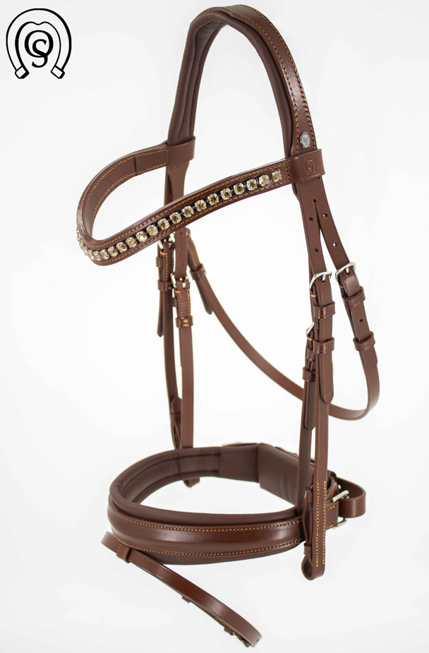 OS Comfort XS trense i smuk brun farve, Havanna. Den er i lækker flad læder og foringen af næsebåndet er med en lidt mørkere super blød foring, som også er i nakkestykket. Foring er af den extra bløde "feel good" foring. Pandebåndet er buet og med 8mm bronze swarovski. Der medfølger web tøjler.