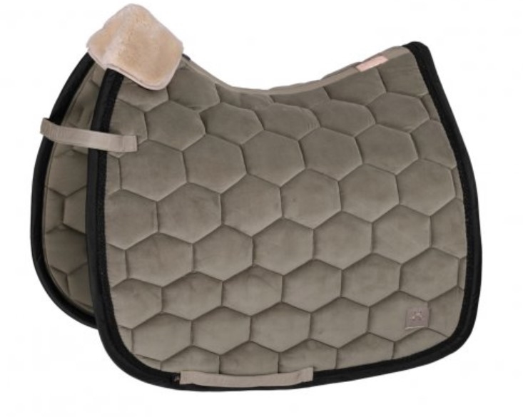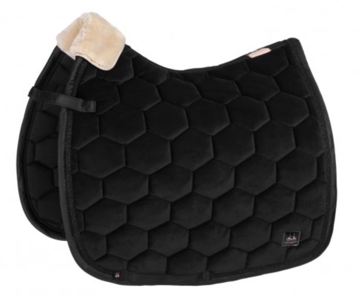 Eskadron Heritage velvet saddle cloth 20/21 - Eskadrons velour underlag er altid ekstra esklusivt. Dette års af slagsen er ingen undtagelse! Velour underlag med flot bred flettet pipe og et ikke alt for stort Heritage logo med rosegold. Den flettede pipe har lidt tone-i-tone sort glitter i. Yderkanten er i sort satin. Et virkelig flot underlag med aftagelig fauxfur ved manken og lækker åndbar underside. Vi har det i sort og ivorygrey.