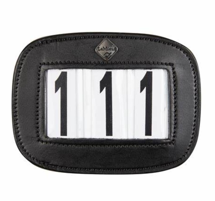 LeMieux lækre og helt enkle stævnenummer i sort læder. Sættes på sadelunderlaget med en sikkerhedsnål, der sidder på stævnenummerets bagside.