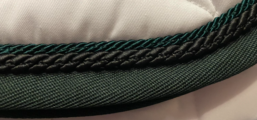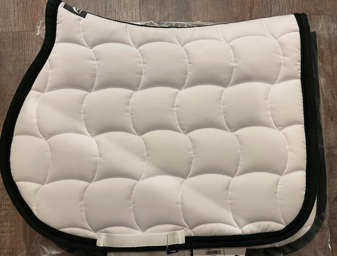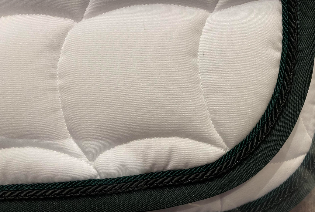 Anna Scarpati er italiensk kvalitet, som er helt i top. Anna Scarpati sadelunderlag er kviltede og med vaflet underside. Det er velsiddende og skånsomt for hesten. Et virkelig lækkert sadelunderlag. Dette er hvidt med mørkegrøn kant og med sort og mørkegrøn pipe.