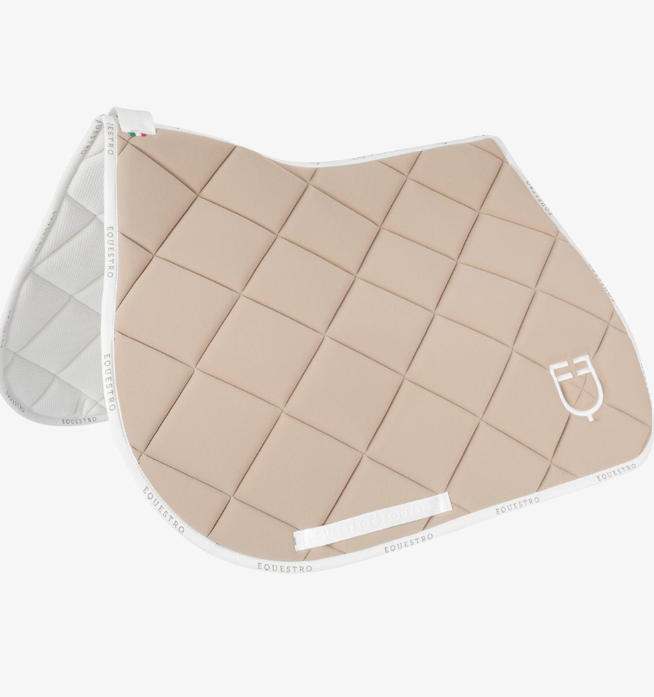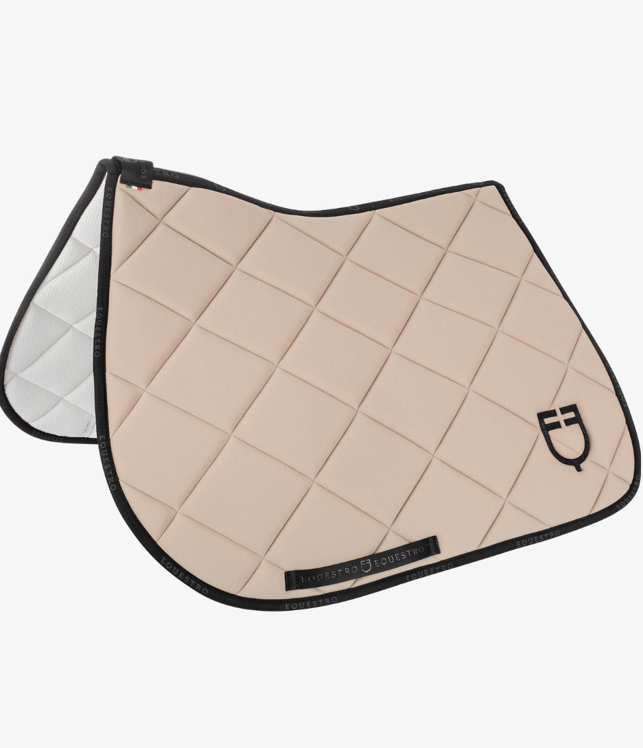 Equestro Gp sadelunderlag i lækkert åndbart materiale. Fint kantebånd med Equestro logo på lige som dette underlag har broderet logo på venstre side. Underlaget er i meget lækkert kviltet kvalitet og god pasform.