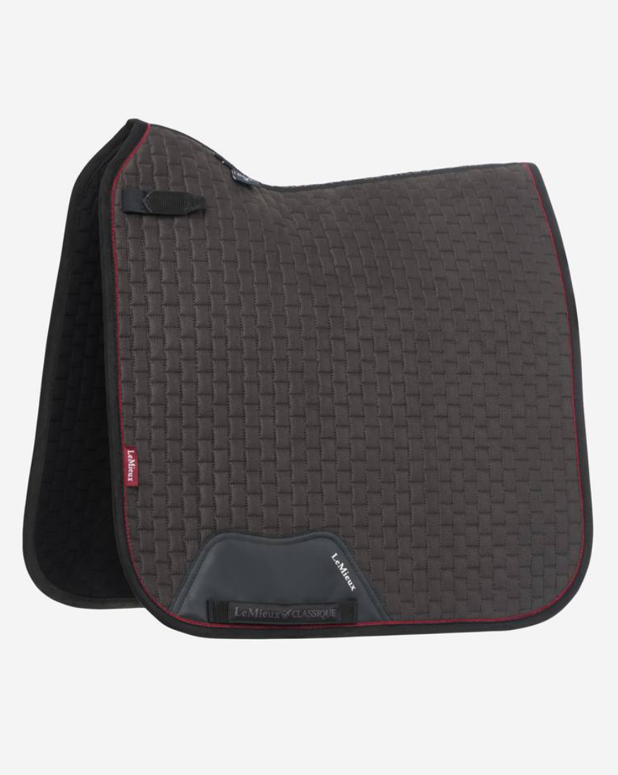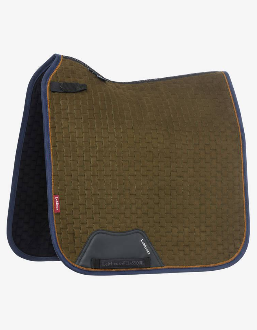 LeMieux's klassiske Suede dressur sadelunderlag er her at finde i efterårsfarverne FW24. Dette sadelunderlag ligger sublimt på hesten. Dette sadelunderlag er i facon til dressursadlen. Et ikonisk sadelunderlag som er kendt for den helt uovertrufne pasform kombineret med behageligt materiale.