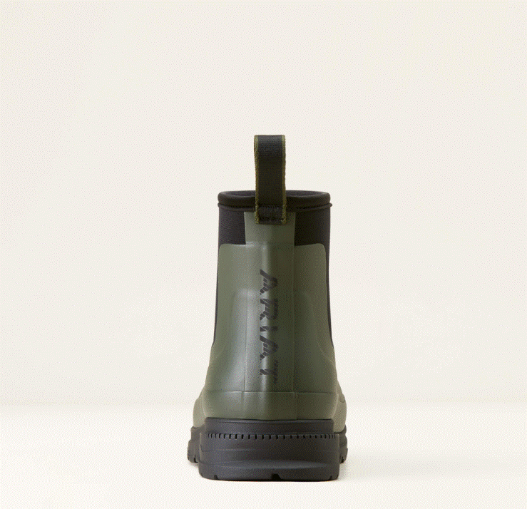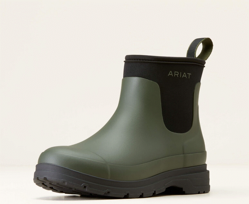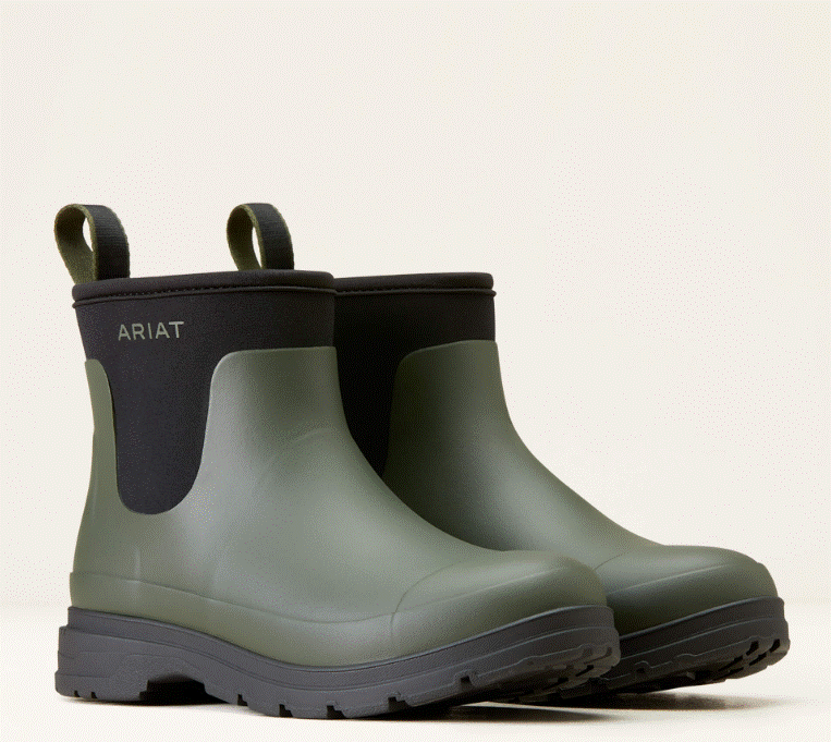 Ariat Kelmarsh gummistøvler gør de våde dage mere udholdelige! Ariat Kelmarsh Shortie er ultra fede korte gummistøvler fra Ariat! Ariat Kelmarsh Shortie er smarte og praktiske gummistøvler som er lige til at hioppe i. Blød neopren om anklerne gør dem både nemme samt behagelige. Fremstillet i stært og blødt gummi som beskytter dine fødder de mange våde dage udendørs. Ariat Kelmarsh har Ariats 4LR lightweight stabiliserende svang, som giver god støtte. De har en god Duratread sål. Ariat logo bagpå. En virkelig fed gummistøvle til prisen- god at have på også i mange timer hvadenten det er i stalden, til gåturen eller når hestene skal ind og ud fra fold. Vi har Ariat Kelmarsh Shortie hjemme i en flot mørk olivengrøn farve. Neoprenen er sort.