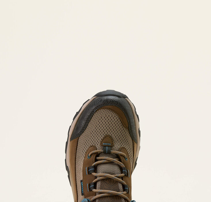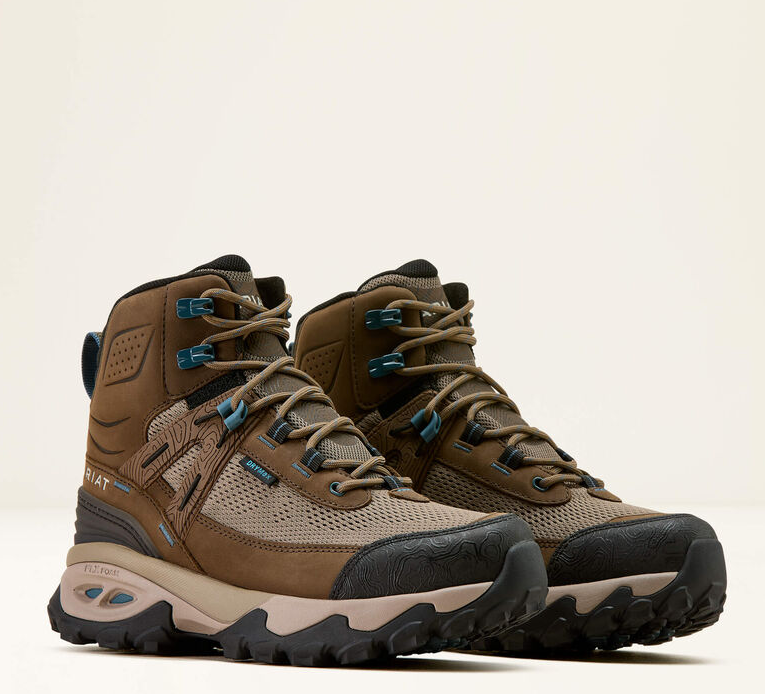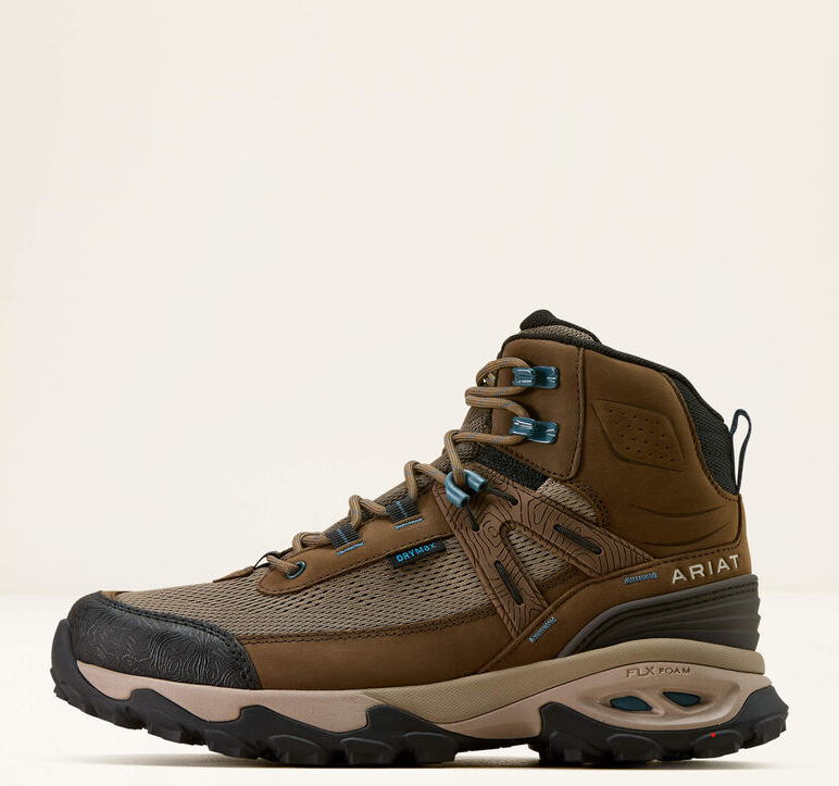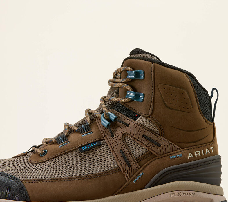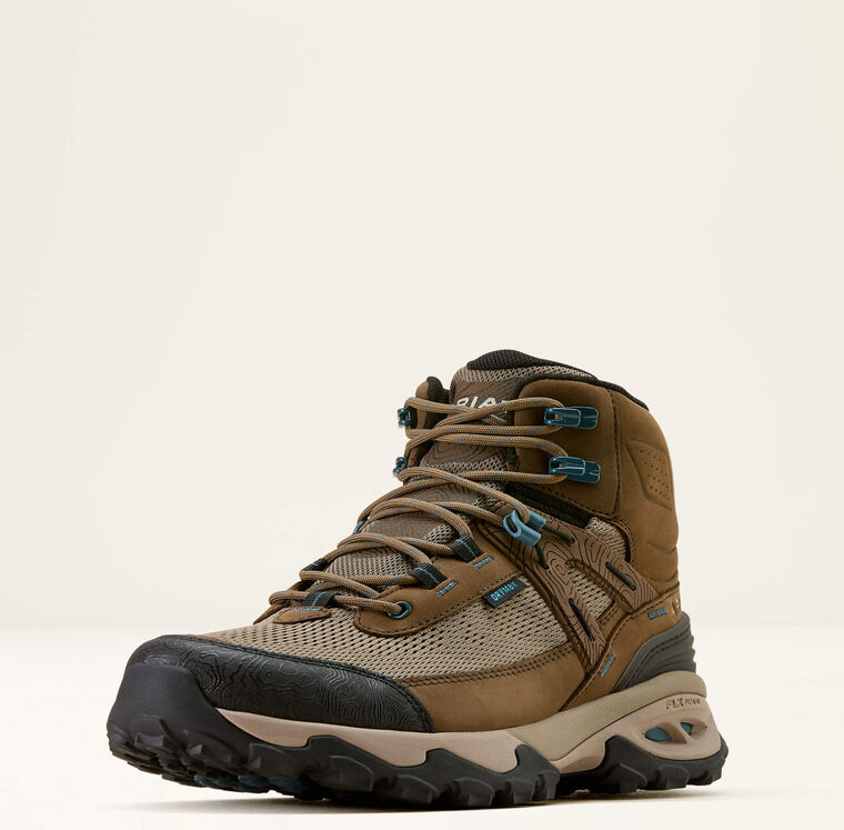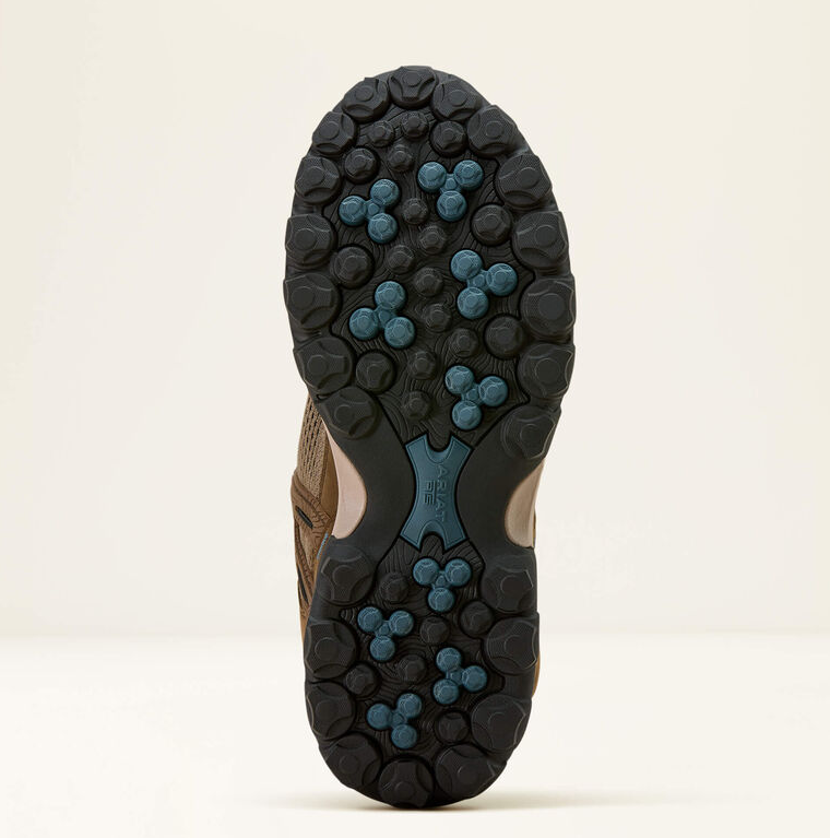 Traverse Mid H20 er med Ariats ATS® teknologi som giver fødderne letvægts støtte og hjælper din fod med at tilpasse sig og giver komfort og stabilitet selv hvis underlaget er ujævnt og ufarbart. Med Ariats Premium DRYMax™ vandtætte og åndbare konstruktion kan du holde fødderne tørre under de fleste vejrforhold. Shock Shield® i sålen gør skoene ekstremt behagelige og stødabsorberende, lige som den populære Ariat All Day Cushioning indersål hjælper fødderne endnu mere på lange dage i naturen. Indersålen kan nemt tages ud. I midtersålen er der en letvægts FLX Foam™ som giver støddæmning og fleksibilitet til hvert skridt du tager. Og ydersålen kan holde til de lange vandreture, da materialet er med Duratread™ sål, som Ariat er kendt for. En sål som ud over at være fleksibelt også er virkelig robust. Ydersålen er innovativ og har på disse Traverse sko fleksible knopper som giver unikt greb og stabtilitet, når underlaget er besværligt at gå i. Skoene har forstærkninger som gør skoene holdbare og i hælen er der ekstra støtte og "Heel-lock" som gør at foden holder sig ekstra godt på plads under bevægelse og aktivitet.