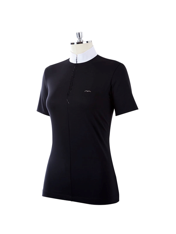 Classy classy - Animo Byorm womans short sleeves competition polo SS2020! En stævnebluse som siger "her kommer jeg". Den er virkelig stilfuld og klassisk men stadig moderne med et lille "Animo"-twist. Der er lynlås fortil og ned langs lynlåsen er der tone-i-tone navy sten som matcher flot ind i den navy bluse. Animo logo ved brystet er i klare sten. En meget klassisk stævnebluse til den stil bevidste rytter som elsker navy! Animos materiale er virkelig lækkert elastisk og pasform er super fin- en bluse der gør det muligt for rytteren både at se godt ud og samtidig have det behageligt og kunne bevæge sig. Og bare vent- denne bluse vil du blive så glad for, at den også kan komme på når du skal se lidt ekstra godt ud på hesten til hverdag!