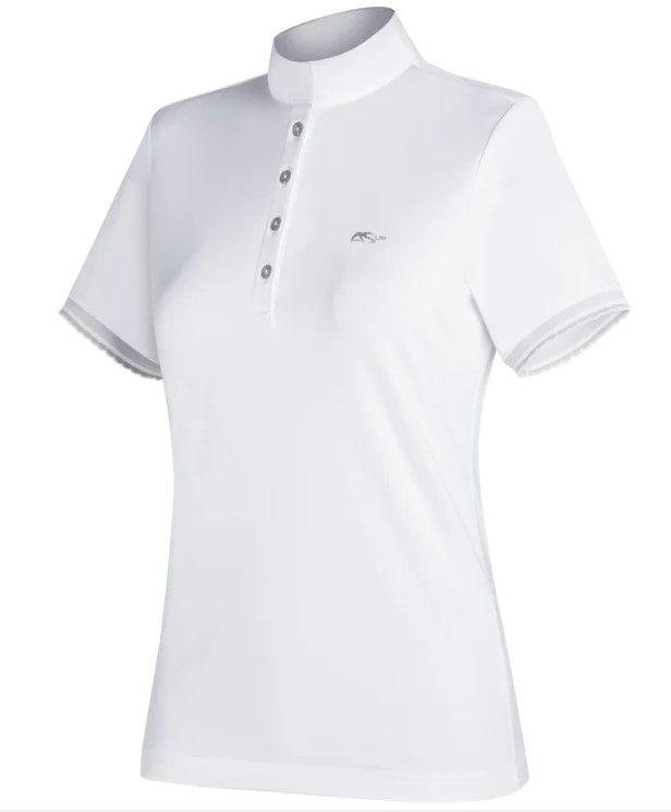 Anna Scarpati Frida er en helt klassisk kortærmet stævnebluse fra italienske Anna Scarpati. Materialet er italiensk når det er bedst- velsiddende, behageligt, stretchy og hurtigtørrende. Super fin bluse med enkle sølvdetaljer i logo og på ærmer. Anna Scarpati er italienske og størrelserne er små så vi anbefaler et man vælger 2-3 størrelser større end man plejer.